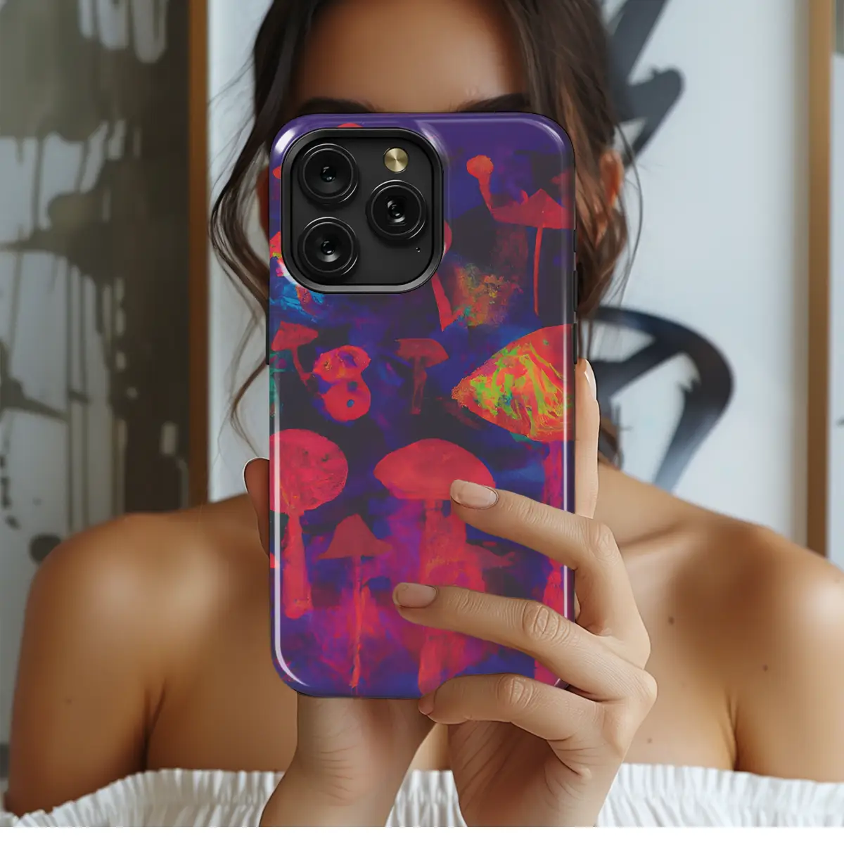 Protect your phone with this vibrant and unique watercolor mushroom phone case. The abstract starburst design gives it a touch of whimsy, while the durable construction provides protection from drops and scratches. Available for iPhone, Samsung, and Pixel phones.