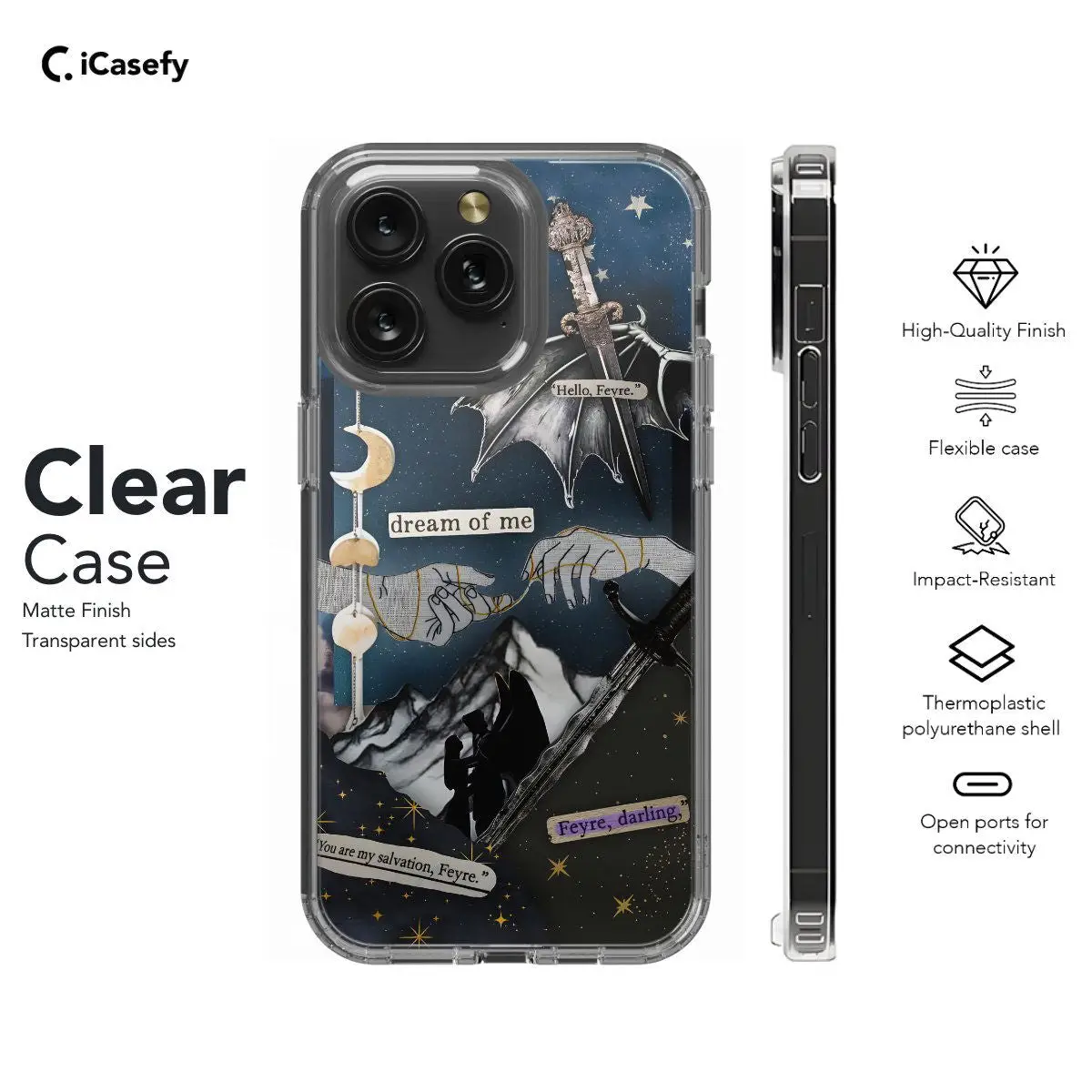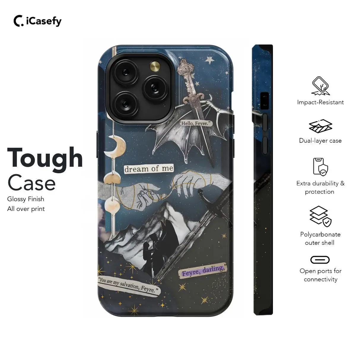 Step into the enchanting world of ACOTAR and ACOMAF with this mesmerizing phone case featuring a collage of scenes from the Night Court, adorned with celestial elements such as the moon and stars. Inspired by the mystical allure of Sarah J. Maas's novels, this case captures the beauty and magic of the Night Court's celestial realm. Carry a piece of Prythian with you wherever you go and let your device become a portal to the breathtaking landscapes and celestial wonders of ACOTAR.