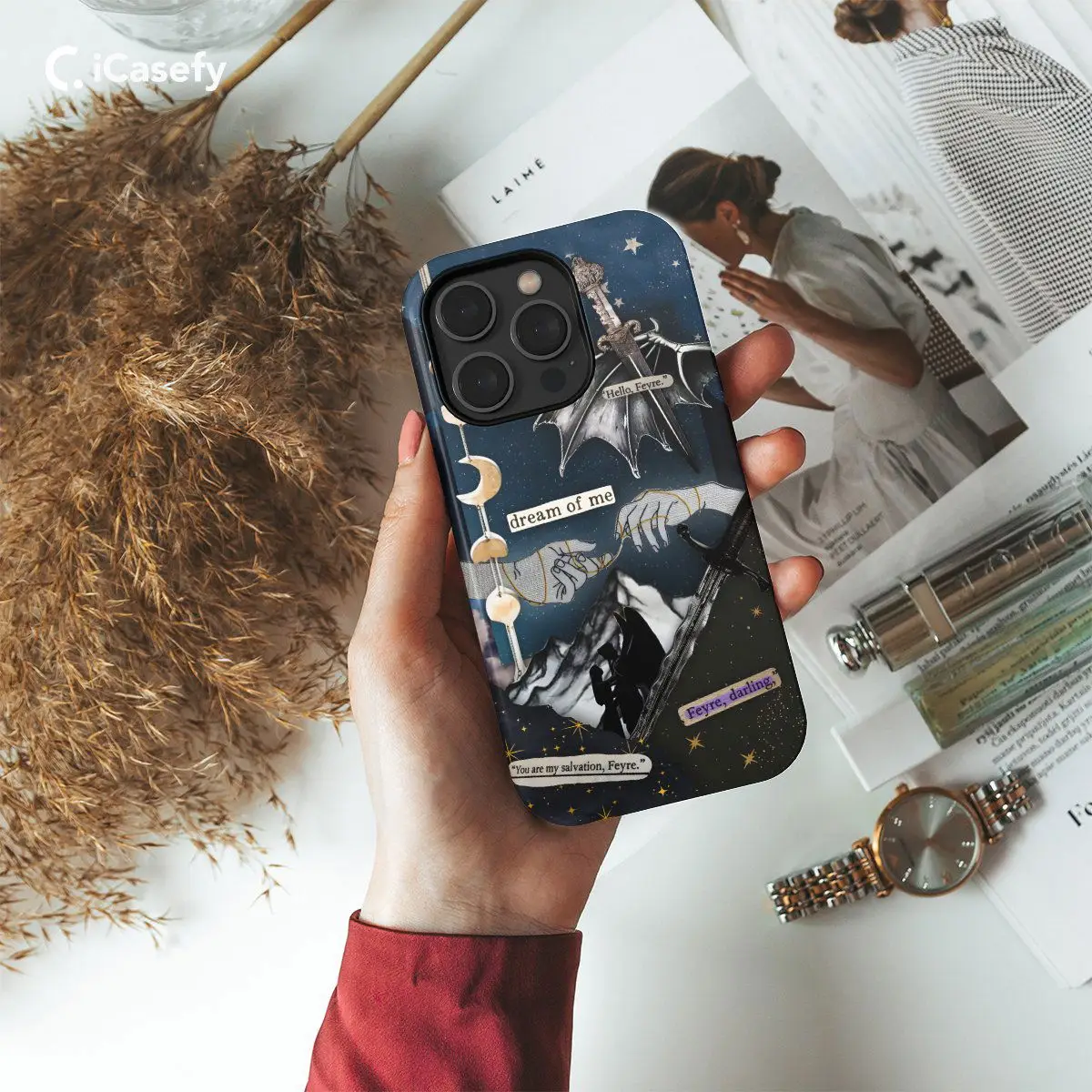 Step into the enchanting world of ACOTAR and ACOMAF with this mesmerizing phone case featuring a collage of scenes from the Night Court, adorned with celestial elements such as the moon and stars. Inspired by the mystical allure of Sarah J. Maas's novels, this case captures the beauty and magic of the Night Court's celestial realm. Carry a piece of Prythian with you wherever you go and let your device become a portal to the breathtaking landscapes and celestial wonders of ACOTAR.