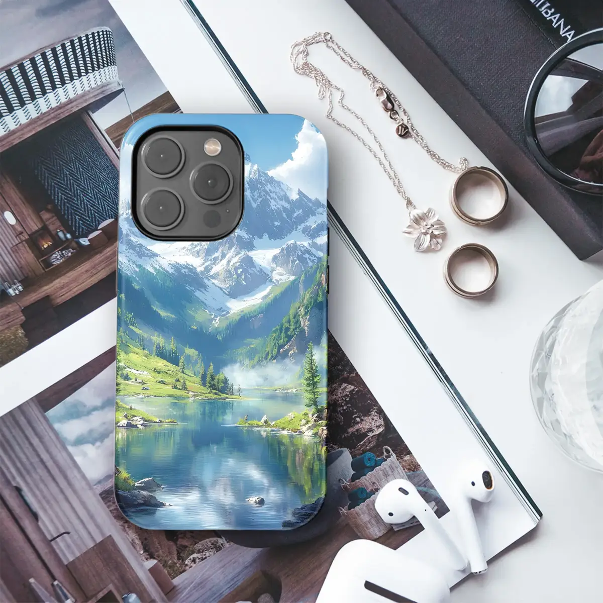 Capture the breathtaking beauty of a serene alpine valley with this stunning landscape design. The artwork features majestic, snow-capped mountains towering over a crystal-clear blue lake, perfectly reflecting the bright sky above. Lush green hillsides dotted with vibrant pine trees cascade down to the water's edge, creating a sense of peace and tranquility for any nature lover.