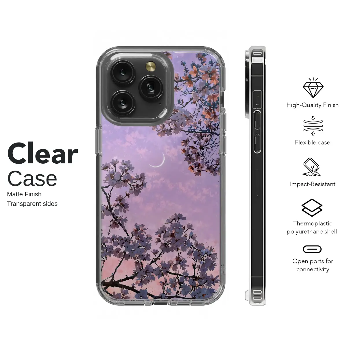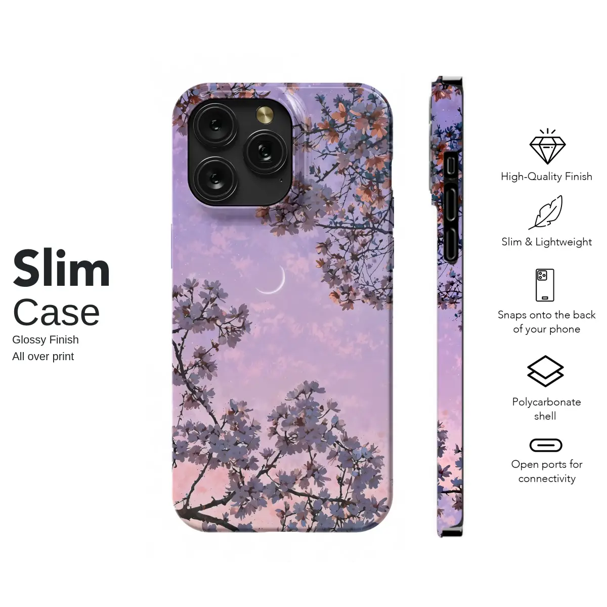 Capture the serene beauty of a twilight sky with this stunning cherry blossom design. This illustration features delicate sakura branches set against a dreamy purple and pink backdrop, while a graceful crescent moon adds a touch of celestial magic to the tranquil, Japanese-inspired scene.