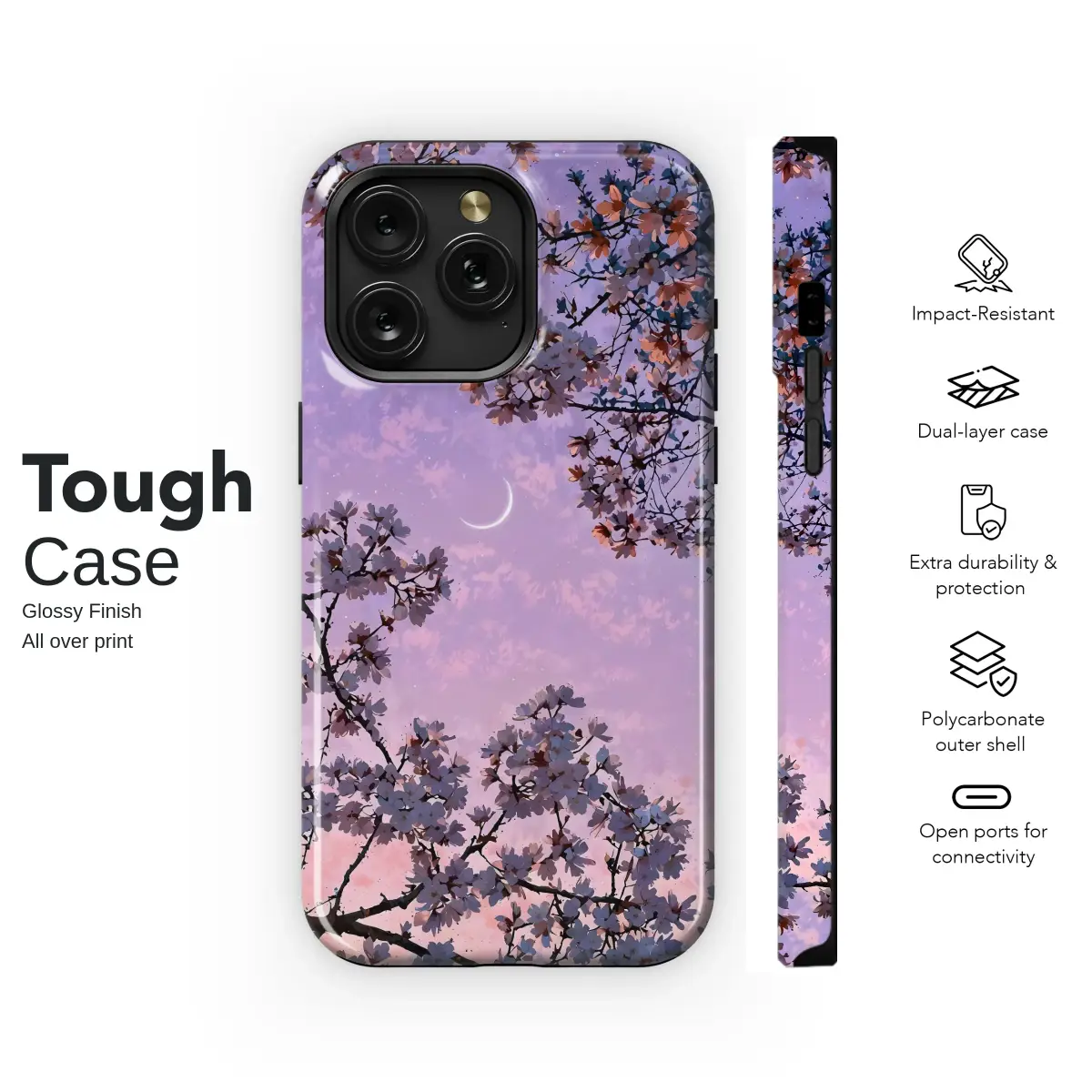 Capture the serene beauty of a twilight sky with this stunning cherry blossom design. This illustration features delicate sakura branches set against a dreamy purple and pink backdrop, while a graceful crescent moon adds a touch of celestial magic to the tranquil, Japanese-inspired scene.