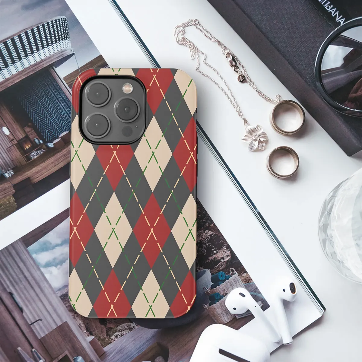 Elevate your style with this sophisticated argyle design, featuring a timeless blend of deep reds, creamy beiges, and forest greens against a charcoal backdrop. The intricate diamond pattern and subtle stitching details create a textured, eye-catching look that’s both classic and contemporary. This high-quality print is vibrant and durable, ensuring your accessory remains stylish for years to come. Perfect for adding a touch of preppy elegance to your everyday life or making a statement with a bold, yet refined aesthetic. Its versatile design seamlessly transitions from casual outings to more formal events, making it the ideal accessory for those who appreciate understated sophistication. The rich color palette and distinctive pattern will turn heads, guaranteed to complement a wide range of personal styles and fashion choices. This design offers an exceptional blend of traditional charm and modern appeal – a perfect gift for yourself or someone who appreciates unique, stylish accessories. Order yours today and experience the difference of quality craftsmanship and striking design. #argyle #diamondpattern #geometricdesign #preppystyle #classicstyle #modernstyle #stylishaccessories #giftforher #giftforhim #uniquegifts #highqualityprint #durableprint #textureddesign