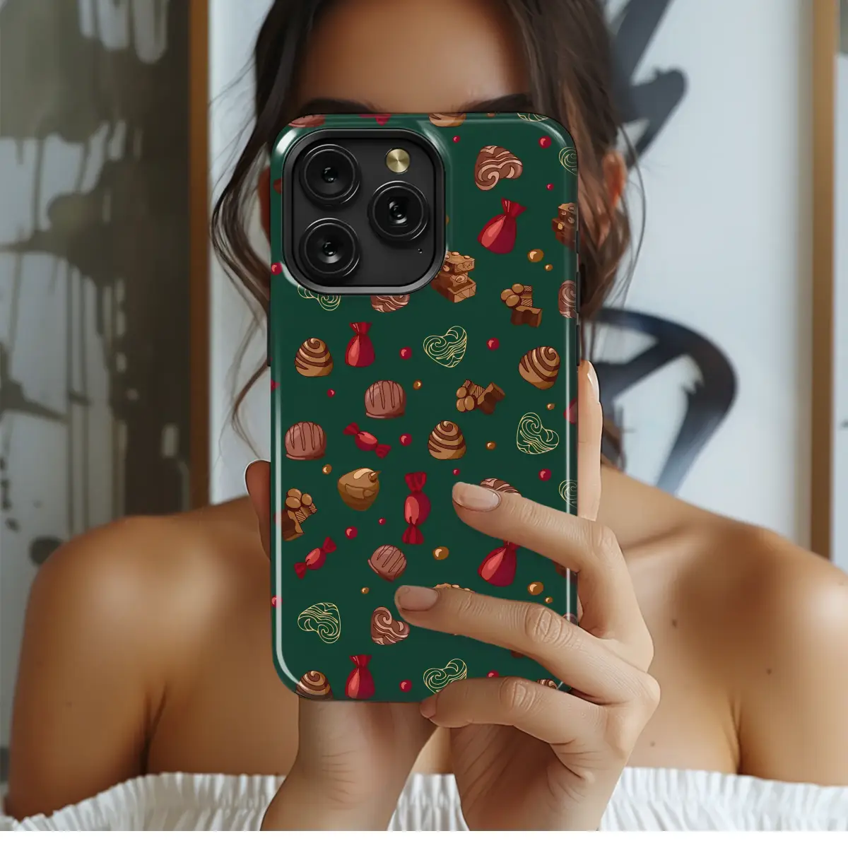 Indulge your sweet tooth with this charming illustrated chocolate pattern. The design showcases a delightful assortment of sweet treats, from rich truffles and nutty pralines to heart-shaped candies and festive wrapped bonbons. Set against a deep emerald green background, the warm browns, vibrant reds, and gold line art accents create a visually delicious and whimsical aesthetic perfect for any candy aficionado.