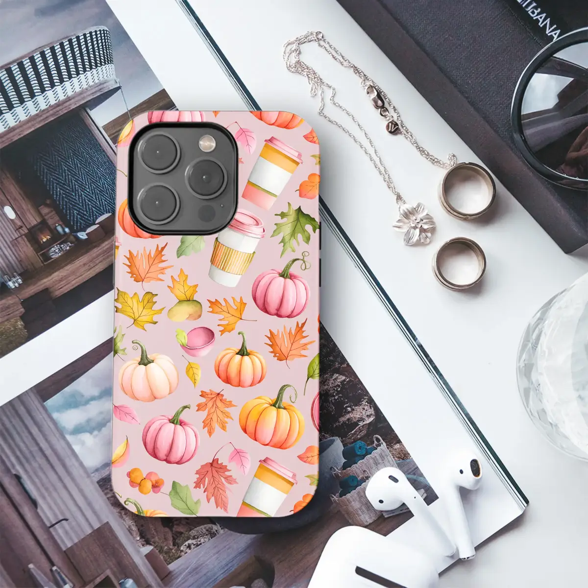 Wrap your most essential companion in the dreamy haze of a perfect autumn morning with this enchanting design. Imagine a whimsical watercolor world where blush pink pumpkins nestle against classic orange gourds, and colorful autumn leaves in shades of amber, gold, and crimson gently drift across a soft, rosy backdrop. Catch a glimpse of your favorite pumpkin spice latte, steaming and ready to warm your hands, captured in this charming, seamless pattern that celebrates the cozy season. This isn't just a design; it's a feeling—the comfort of your favorite sweater, the sweet scent of a fall bakery, and the magic of the harvest, all held in the palm of your hand. It’s the perfect way to carry a little pocketful of autumnal joy with you, turning a daily necessity into a statement of your love for all things cozy and cute. Let this beautiful artistic illustration dress up your tech and complete your fall aesthetic. An ideal gift for the autumn lover in your life, this unique piece brings a touch of sweater weather charm and girly fall style to your everyday hustle, ensuring your most-used accessory is as stylish and ready for the pumpkin patch as you are.