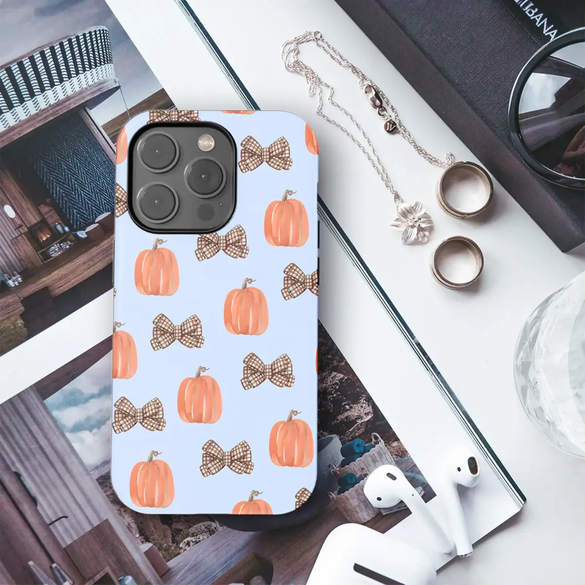 Embrace the cozy charm of autumn with this delightful design. Featuring a repeating pattern of hand-painted watercolor pumpkins interspersed with rustic brown plaid bows. The entire motif is set against a soft, light blue background, creating a whimsical and preppy aesthetic perfect for the fall season.
