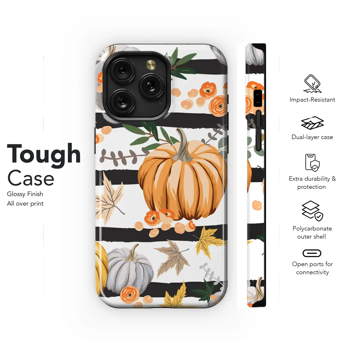 Protect your phone in style with this autumn-themed phone case. Featuring a seamless pattern of pumpkins, flowers, and leaves, this case is perfect for the fall season. Made from durable materials, this case will keep your phone safe from scratches, bumps, and drops. Compatible with a variety of iPhone, Samsung, and Pixel models, this case is a must-have for anyone who loves autumn.