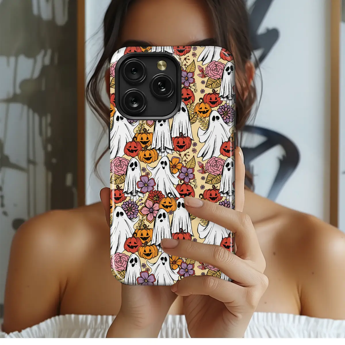 Embrace the magic of a whimsical autumn dream where spooky season meets a groovy, floral daydream, all captured in a little piece of art designed to be your daily companion. Imagine a secret garden bathed in the warm glow of a harvest moon, where cheerful little ghosts with friendly smiles float and dance among grinning, jack-o'-lantern pumpkins. This isn't just a spooky pattern; it's a celebration of cottagegore charm, brought to life with a retro-inspired palette of dusty pink roses, warm orange blossoms, and deep purple wildflowers, all set against a soft, creamy backdrop that feels like a page from a vintage storybook. Perfect for the soul who lives for crisp autumn air, believes Halloween can be both cute and enchanting, and wants to adorn their most essential tech with a touch of personality. Let this delightful scene wrap your daily lifeline in a protective layer of pure, handcrafted-style joy. It's the ultimate accessory for any boho spirit or witchy aesthetic lover, making it a wonderful spooky season gift or a treat for yourself. Carry a pocketful of happy haunts and blooming botanicals wherever you go, and let your personal style tell a charmingly eerie story.