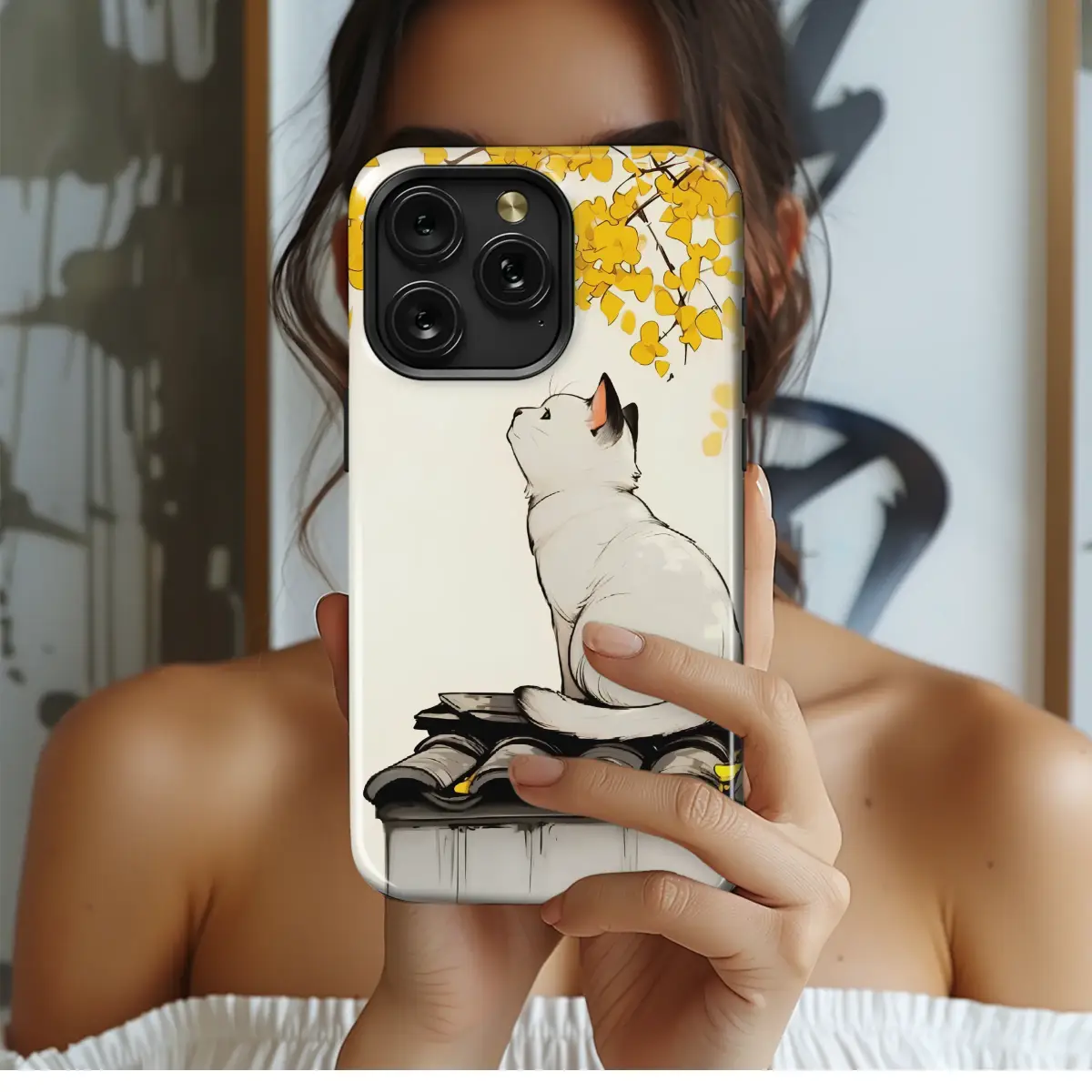 Capture a fleeting moment of pure serenity and carry it with you every day. In this enchanting design, a graceful white cat sits in quiet contemplation upon a traditional tiled roof, its gaze lifted towards a cascade of brilliant golden ginkgo leaves. A single leaf, caught in a gentle breeze, drifts downward, symbolizing the beautiful, transient nature of a perfect autumn day. Rendered in a stunning, minimalist Japanese art style that blends the elegance of traditional ink wash with a touch of modern anime aesthetic, this illustration is a tiny poem for your pocket. It’s a wearable piece of art that speaks of peaceful afternoons, the gentle turning of the seasons, and the quiet joy found in simple observation. Let this tranquil feline companion bring a touch of cozy, cottagecore calm to your daily essentials, making it the perfect thoughtful gift for any cat lover, dreamer, or soul who appreciates the delicate beauty of nature. Wrap your most-used device in a story of peaceful wonder and carry a constant reminder to pause, look up, and appreciate the small, magical moments all around you.