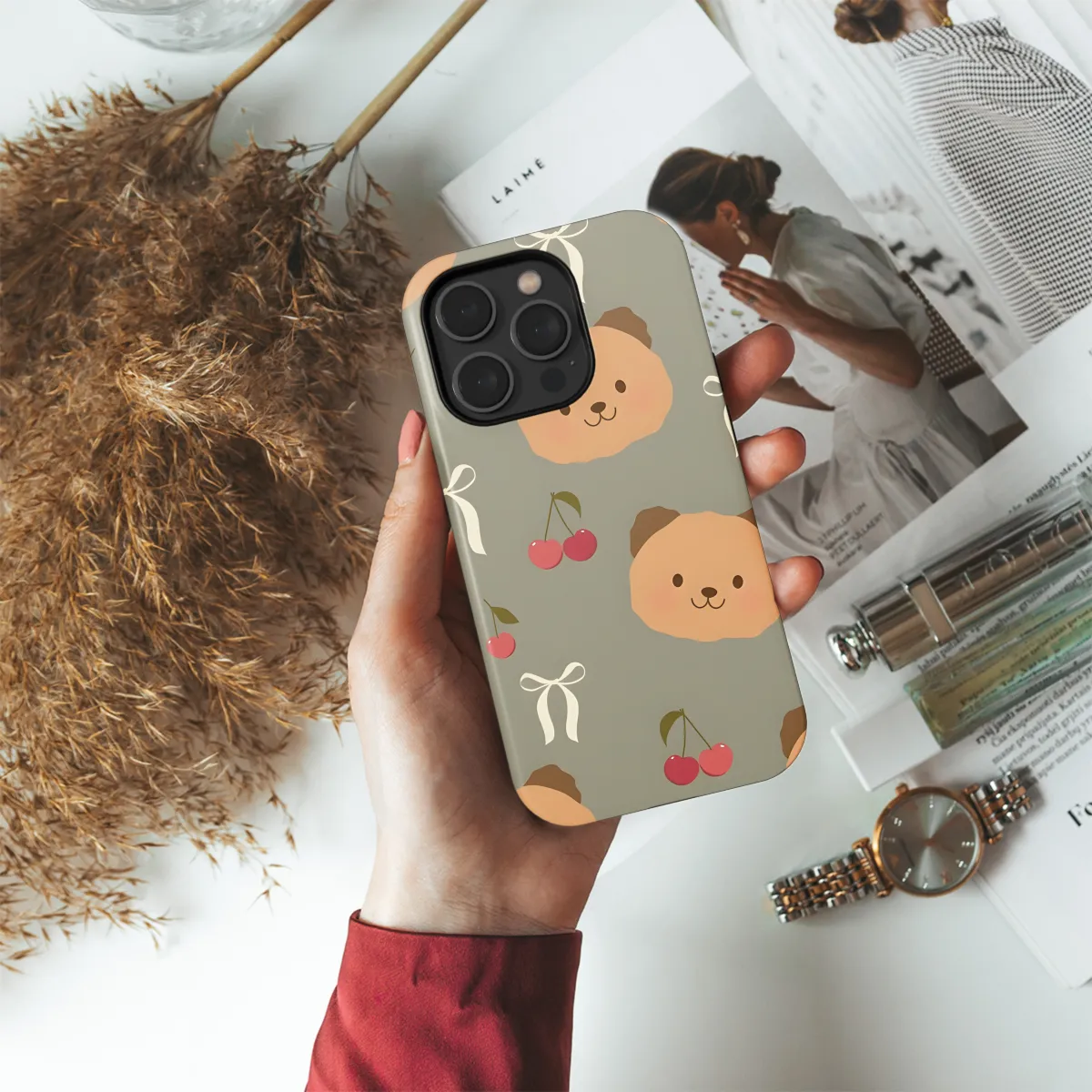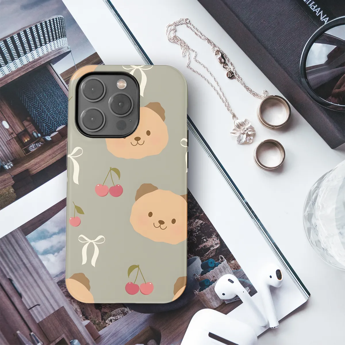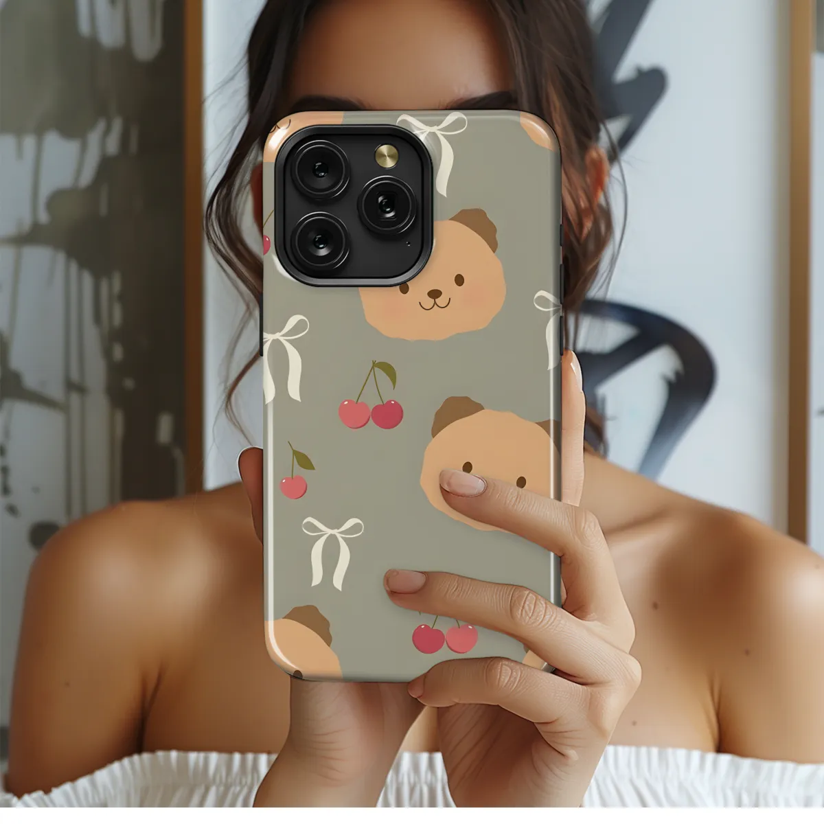 Protect your phone with style and personality using our Bear Head Bows and Cherries Phone Case. Featuring a whimsical design of a bear's head adorned with bows and cherries, this case adds a touch of fun and charm to your device. Compatible with iPhone, Samsung, and Pixel models, it offers both protection and a fashionable accent.