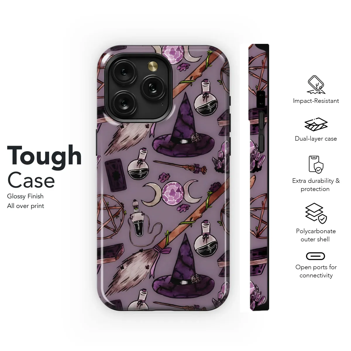 Embrace your inner witch with this enchanting accessory featuring a rich, dark pattern inspired by the mystical arts. Dive into a design world filled with symbols of ancient power and spiritual tools. Adorn your essential daily item with intricate illustrations including pointed hats, whisked brooms tied with ribbons, slender wands ready for casting, and thick, bound spellbooks holding forgotten secrets. The pattern is richly detailed with potent symbols like the protective pentagram woven from branches and leaves, clear bottles brimming with magical elixirs and potions, clusters of vibrant purple crystals radiating powerful energy, and the sacred celestial representation of the triple moon phases. This design captures the essence of witchcraft and the occult, bringing a touch of gothic elegance and spiritual depth to your portable companion. Perfect for anyone drawn to paganism, Wicca, or simply the allure of magic, this artistic expression allows you to carry your aesthetic and interests with you everywhere you go. Infuse your everyday with this mystical energy and let the magic unfold, making your item a unique and personal statement piece reflecting your connection to the esoteric arts and the natural world's hidden powers, all rendered in captivating purple hues and earthy tones.