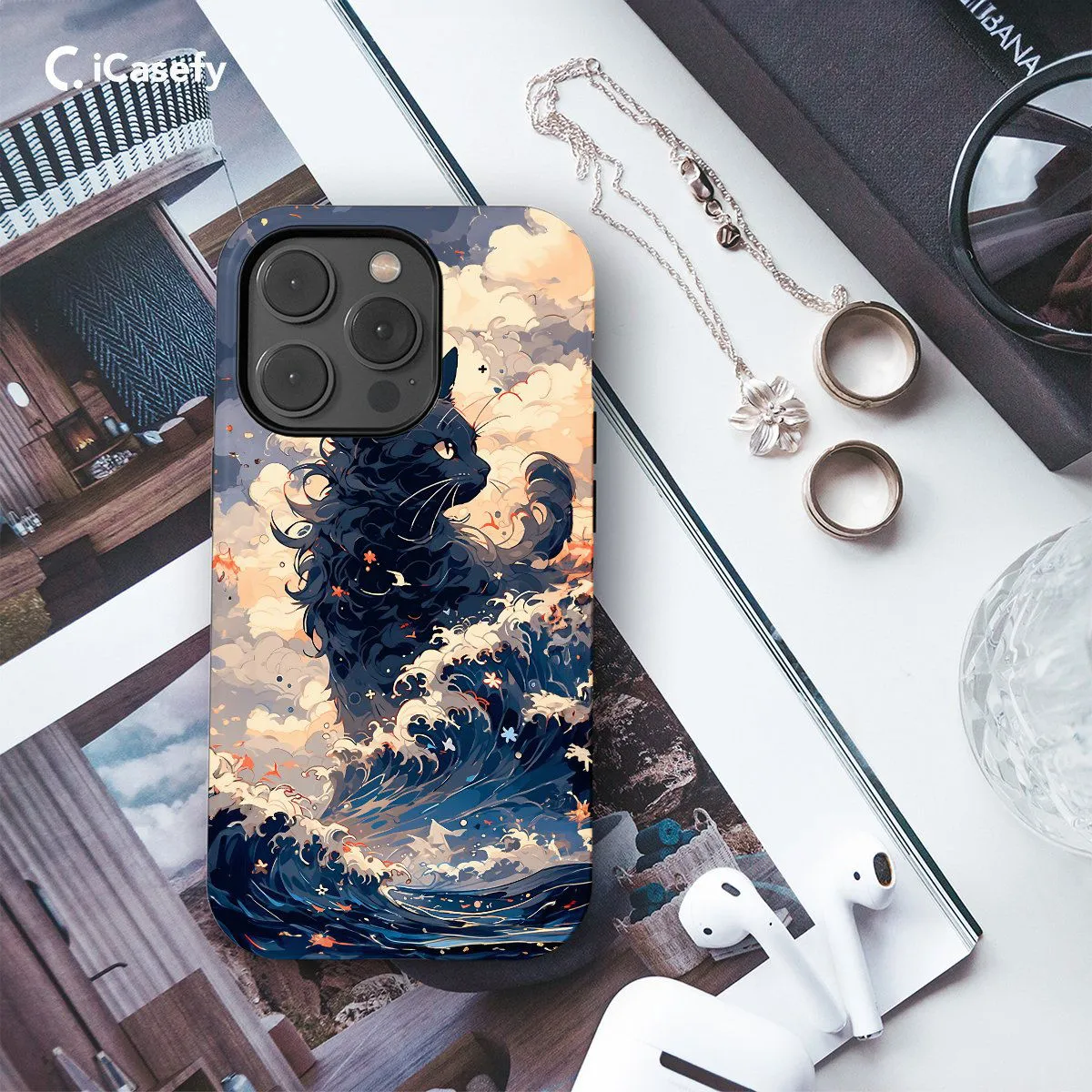 Immerse yourself in a unique fusion of elegance with our Black Cat Clouds Great Wave phone case. This captivating design blends the mystical charm of black cats with the iconic imagery of "The Great Wave off Kanagawa," surrounded by swirling clouds. Crafted for art enthusiasts and cat lovers alike, it offers both style and protection, with precise cutouts for easy access to ports. Let this accessory be a symbol of creativity and grace.