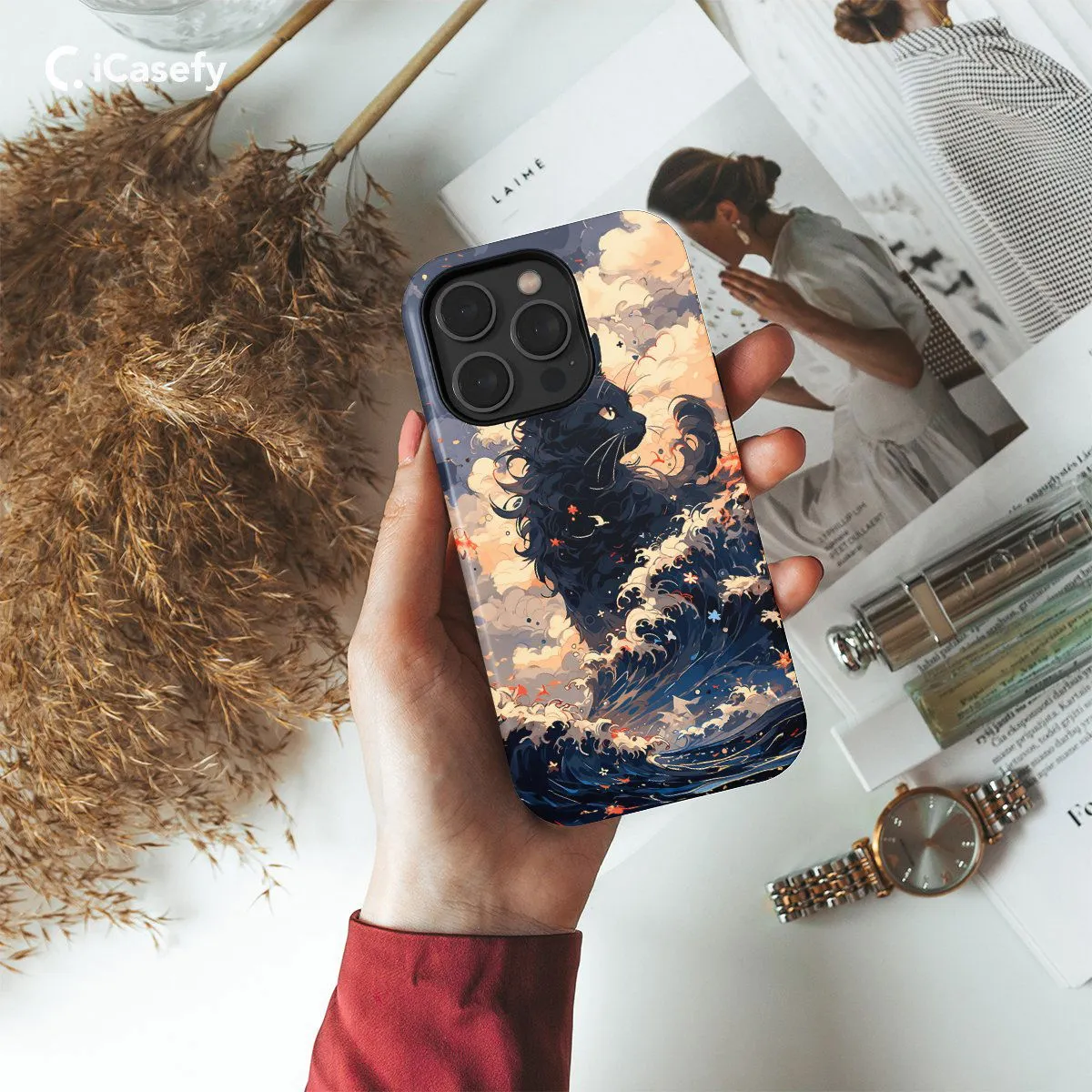 Immerse yourself in a unique fusion of elegance with our Black Cat Clouds Great Wave phone case. This captivating design blends the mystical charm of black cats with the iconic imagery of "The Great Wave off Kanagawa," surrounded by swirling clouds. Crafted for art enthusiasts and cat lovers alike, it offers both style and protection, with precise cutouts for easy access to ports. Let this accessory be a symbol of creativity and grace.
