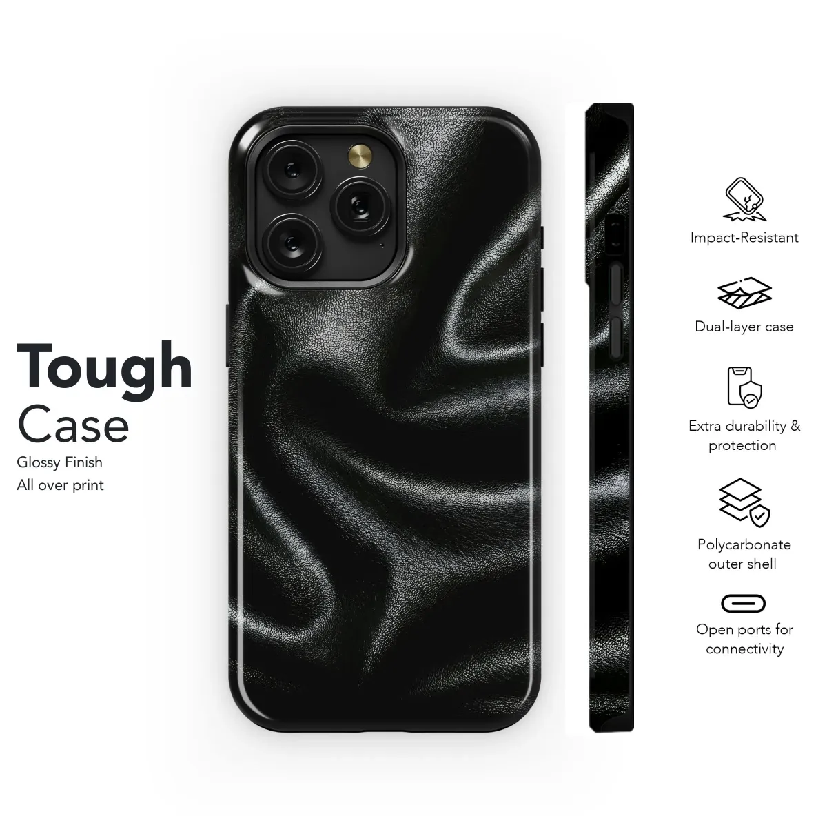 Sleek and sophisticated, this black leather texture phone case adds a touch of luxury to your iPhone, Samsung, or Pixel. Premium protection with a stylish grip. Available for models 4849.