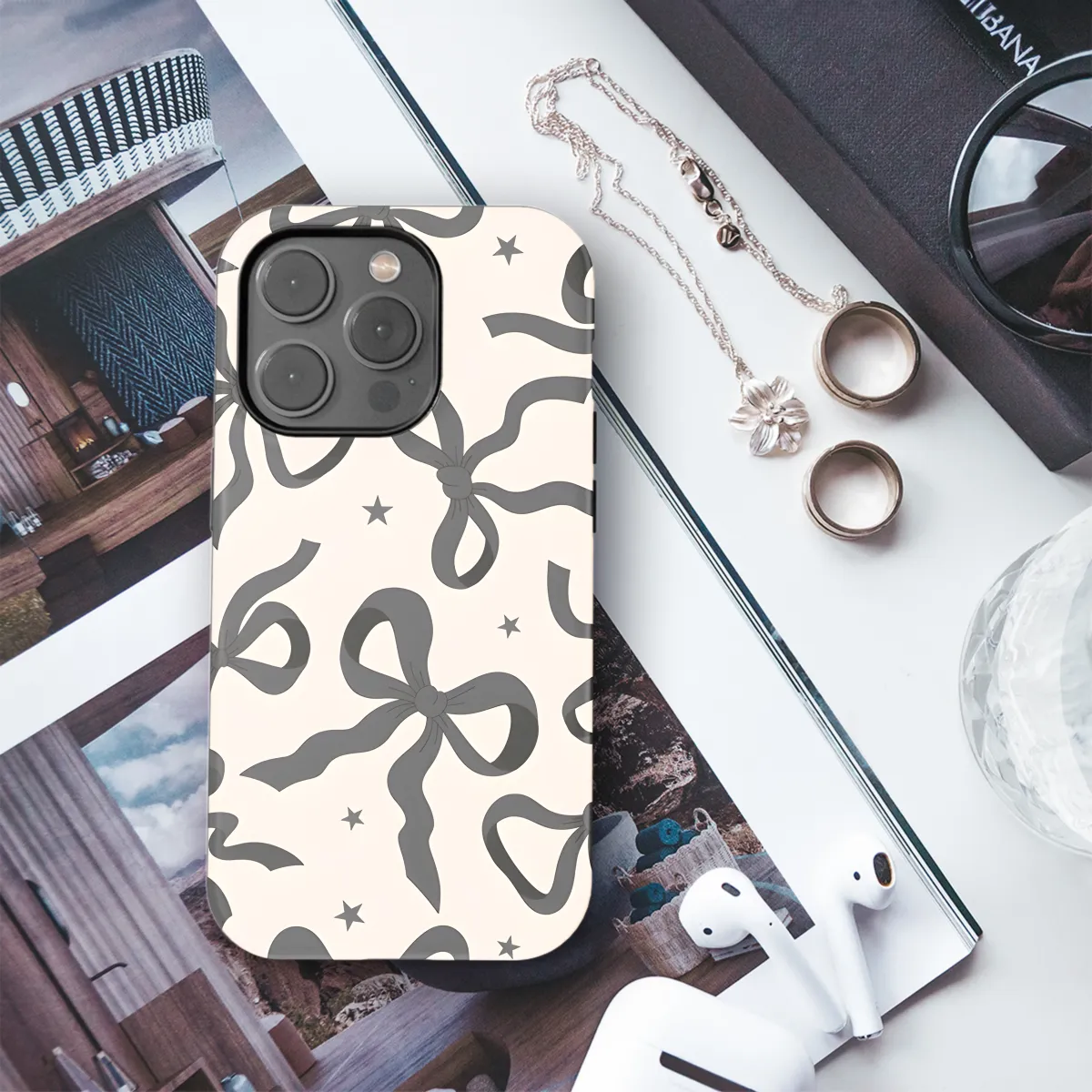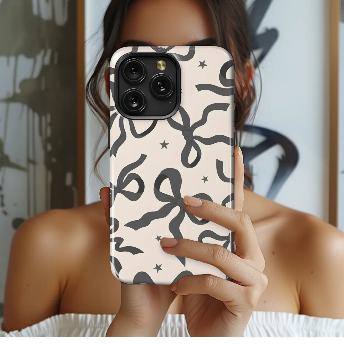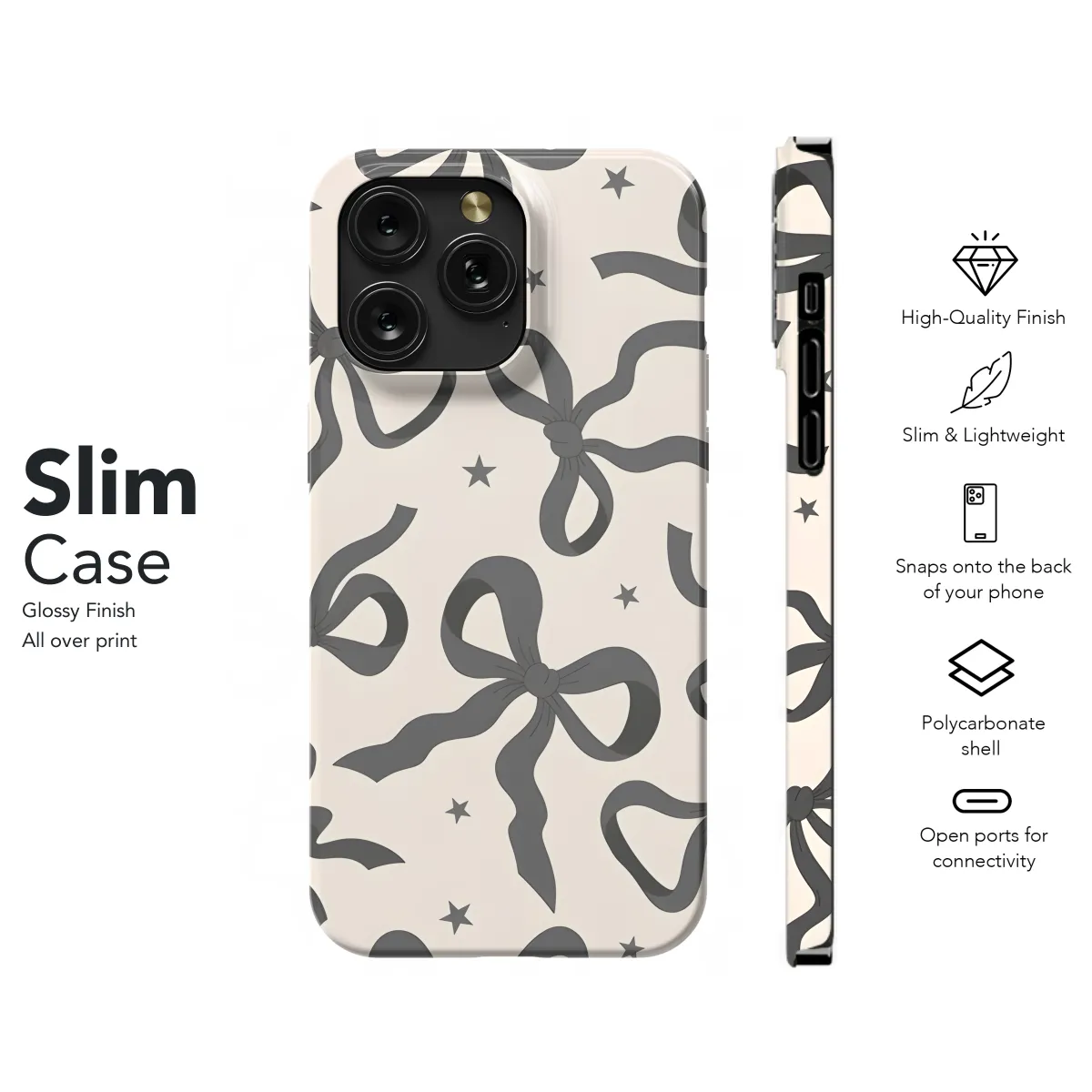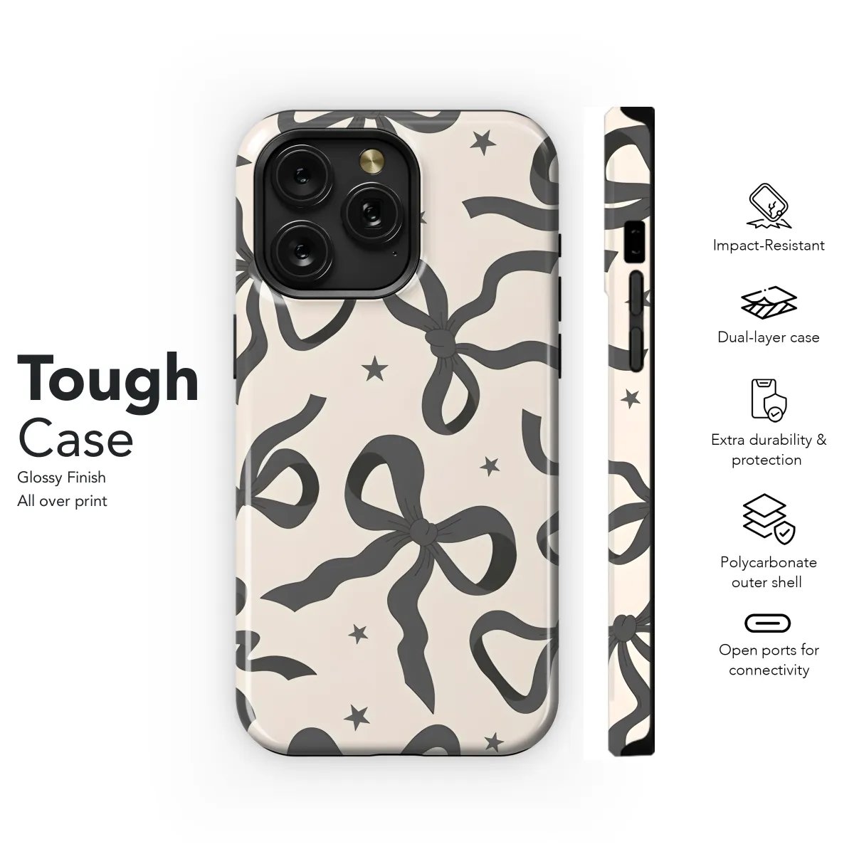 Elevate your phone's style with this elegant Black Ribbon Bow phone case. Its sleek design features a chic ribbon bow accent, adding a touch of sophistication to your device. The durable construction safeguards your phone against scratches, bumps, and everyday wear and tear, ensuring its protection without compromising its aesthetic appeal. Compatible with iPhone, Samsung, and Pixel devices, this case offers a snug fit and easy access to all buttons, ports, and camera. Embrace both functionality and style with this exquisite Black Ribbon Bow phone case.