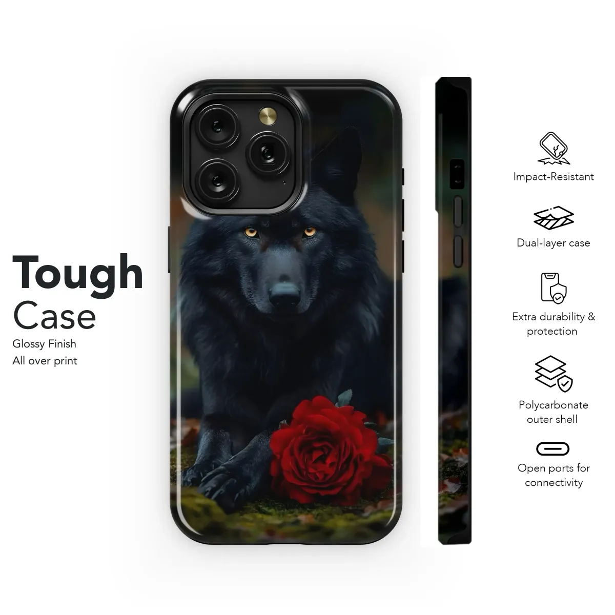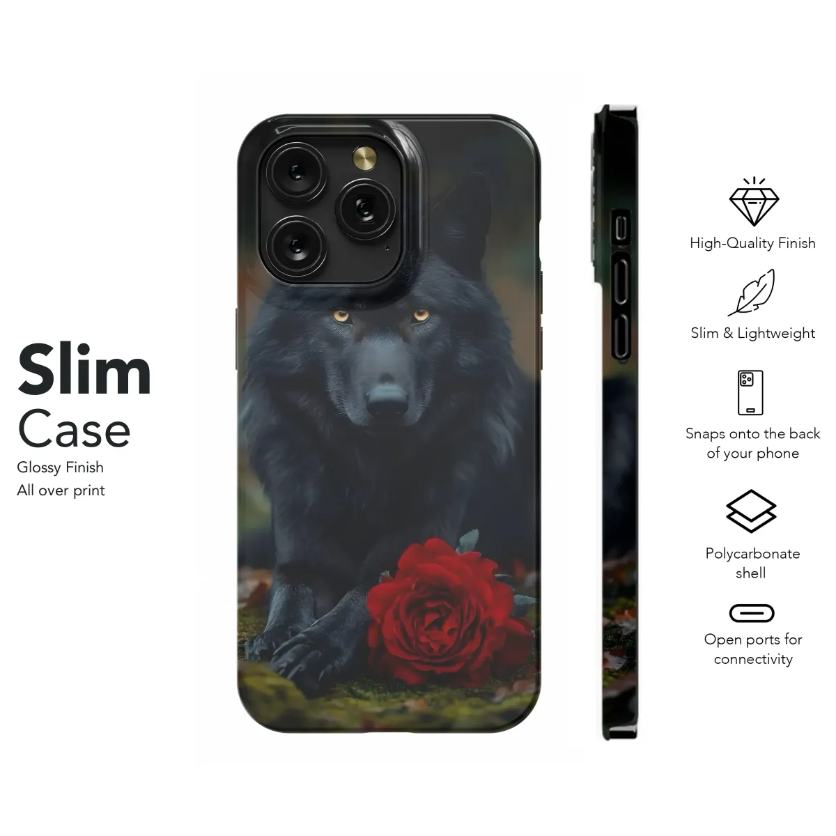 Unleash your wild side with this captivating design featuring a majestic black wolf, its piercing golden eyes gazing intensely, paired with a deep crimson rose. This striking image embodies power, mystery, and a touch of romantic darkness, perfect for those who appreciate bold aesthetics and unique self-expression. The intense contrast of the black fur against the vibrant red flower creates a visually arresting piece that's guaranteed to turn heads. High-quality printing ensures the vibrant colors and intricate details of the wolf and rose are beautifully preserved, making this a truly unforgettable accessory. Showcase your fierce spirit and individual style with this breathtaking design; it's more than just an accessory, it's a statement. A perfect gift for wolf lovers, nature enthusiasts, and anyone who embraces their inner wild. Order yours today and transform your everyday carry into a work of art. This design is printed on high-quality materials for optimal durability and vibrant color retention. Embrace the beauty of the wild, one accessory at a time.