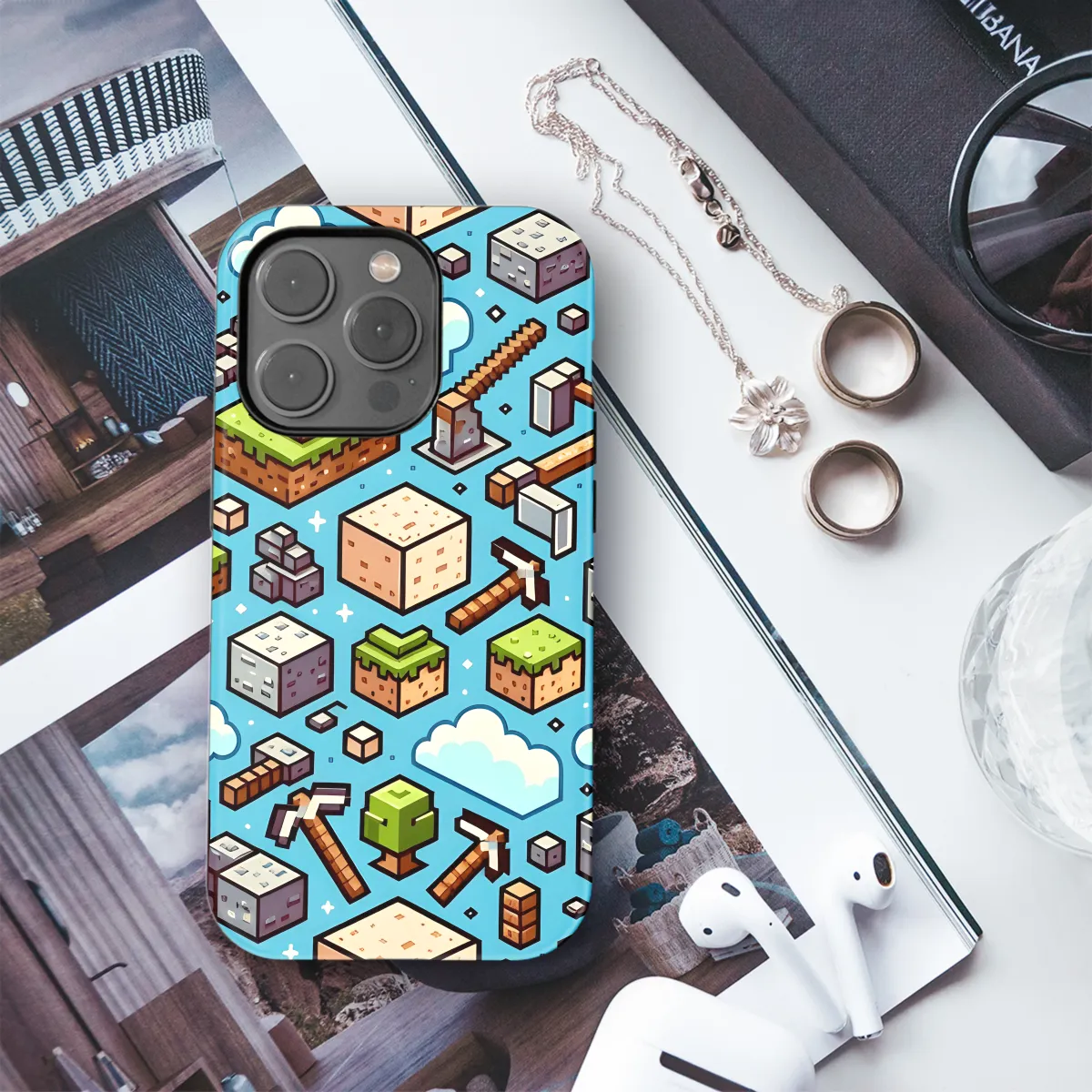 This phone case is inspired by the popular video game Minecraft and features a vibrant design of a pickaxe. It is made from durable and flexible TPU material, providing excellent protection against scratches, dust, and impacts. The case is compatible with a wide range of iPhone, Samsung, and Pixel models, ensuring a perfect fit for your device. Its precise cutouts allow easy access to all ports, buttons, and the camera, while the raised edges offer additional protection for the screen. With its unique and eye-catching design, this phone case is a must-have for any Minecraft fan.