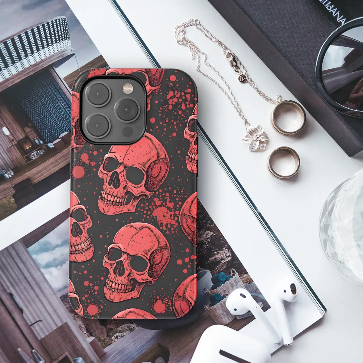 This striking design features a repeating pattern of intricately detailed, crimson skulls set against a dark background splattered with blood-red accents. The intense color contrast creates a bold, visually arresting effect, perfect for expressing a unique and edgy style. Each skull is meticulously rendered, showcasing the fine lines and textures of bone, adding a layer of depth and realism to the gothic aesthetic. This captivating print is guaranteed to turn heads and is ideal for those who appreciate dark art and macabre designs. The high-quality print ensures vibrant colors and lasting durability, making this a sophisticated and long-lasting accessory choice. Add a touch of rebellious glamour and make a statement with this daring and memorable design. It’s a perfect gift for yourself or someone who appreciates bold aesthetics and skull imagery, adding a touch of the darkly romantic to any outfit. The intricate detail and rich color make this a stand-out piece, ideal for gothic lovers, Halloween enthusiasts, and anyone seeking a truly unique accessory. This design guarantees to be a conversation starter.