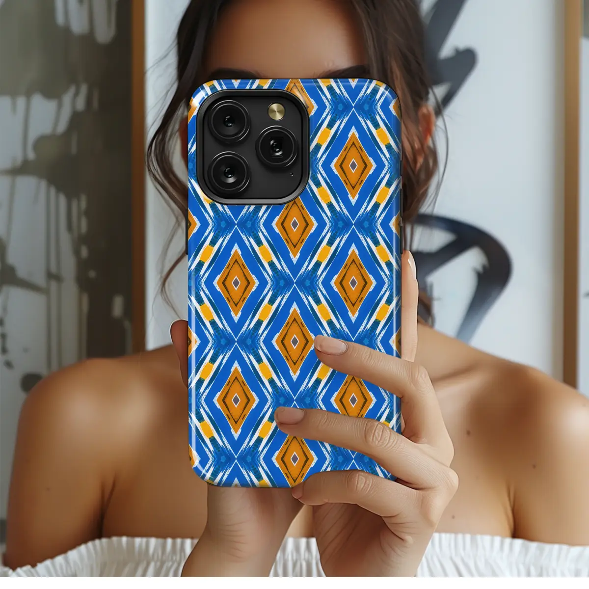 Introducing the Blue and Golden Diamond Geometric Phone Case, the perfect way to protect your precious device in style. This stunning case features a mesmerizing geometric pattern in shades of blue and gold, adding a touch of elegance to your everyday essential. Its durable construction ensures optimal protection against scratches, drops, and other daily mishaps. Compatible with a wide range of iPhone, Samsung, and Pixel devices, this case is the ultimate combination of functionality and fashion.