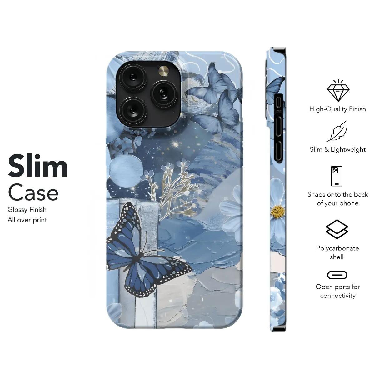 Ethereal blue butterflies flutter across this dreamy phone case. Protect your iPhone, Samsung, or Pixel with style and grace. Fits models 4, 5, 6, 7, and 575.