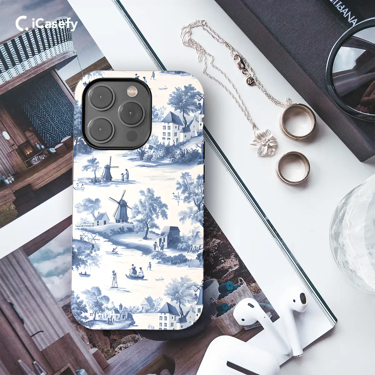 Embrace the charm of the countryside with our Blue Windmill House Trees Toile De Jouy Phone Case. This elegant cover features a captivating toile de Jouy print adorned with windmills, trees, and houses. Each element is delicately rendered in shades of blue, creating a timeless allure. Perfect for those who seek a touch of rustic chic, this case will safeguard your phone while adding a dash of style to your daily routine.