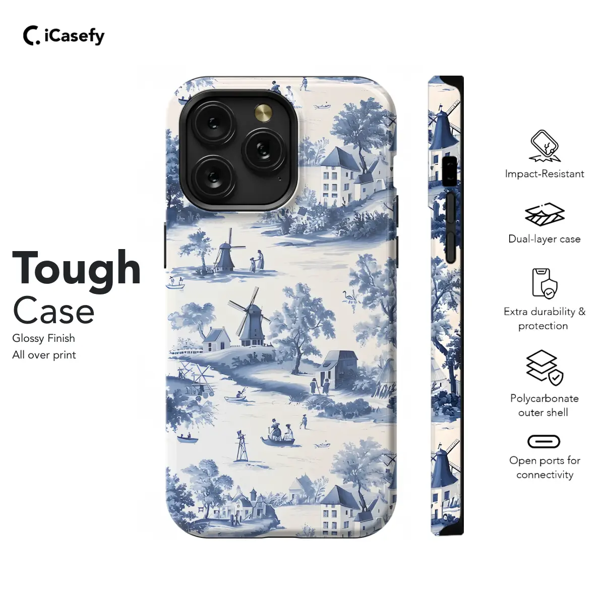 Embrace the charm of the countryside with our Blue Windmill House Trees Toile De Jouy Phone Case. This elegant cover features a captivating toile de Jouy print adorned with windmills, trees, and houses. Each element is delicately rendered in shades of blue, creating a timeless allure. Perfect for those who seek a touch of rustic chic, this case will safeguard your phone while adding a dash of style to your daily routine.