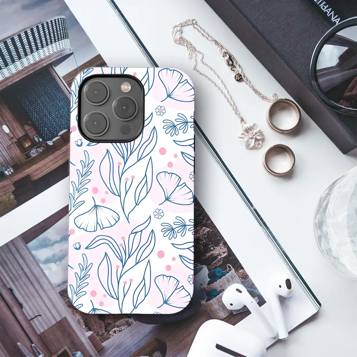 Discover the understated elegance of this beautiful nature-inspired print, perfect for adding a touch of botanical charm to your everyday essentials. This delicate pattern features a lovely array of hand-drawn line art leaves, including flowing stems and distinct ginkgo shapes, interspersed with charming clusters of berries and tiny floral accents. Rendered in sophisticated navy blue lines against a soft white background, the design is further enhanced by subtle blush pink dots and organic shapes that add a gentle pop of color and dimension. The minimalist yet detailed style brings a fresh, contemporary aesthetic, evoking the serene beauty of a hidden garden or a tranquil woodland path. This aesthetic accessory is more than just a design; it's a statement piece that reflects a love for natural beauty and refined taste. Ideal for personalizing your handheld tech device, this slim, lightweight design offers a unique way to express your style while keeping your essential item looking fresh and fashionable. The intricate illustration is perfect for those who appreciate subtle elegance and a touch of modern botanical artistry in their daily items. Add this trendy and stylish print to your collection for a touch of spring or summer vibe year-round, a perfect gift for her or anyone who loves unique patterns and delicate plant motifs. Experience the blend of artistic illustration and functional accessory with this eye-catching botanical print, ensuring your item stands out with its unique, elegant appeal and durable protection.