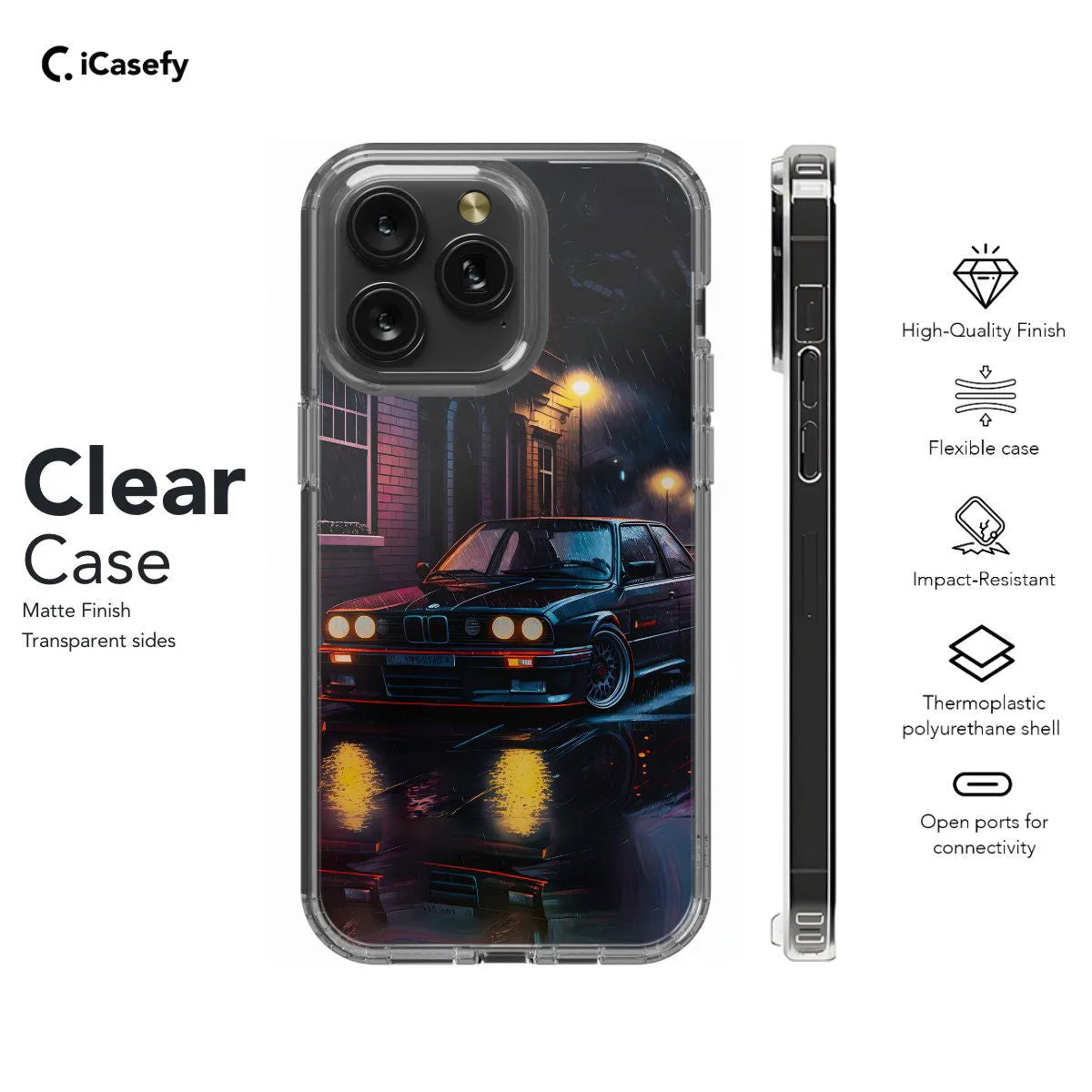 Celebrate the iconic BMW E30 with this sleek and stylish phone case featuring the classic design of this legendary car. With its distinctive silhouette and timeless appeal, the BMW E30 is a symbol of automotive excellence and performance. Carry a piece of automotive history with you wherever you go, letting your device become a tribute to the enduring legacy of this beloved classic car with this eye-catching accessory.