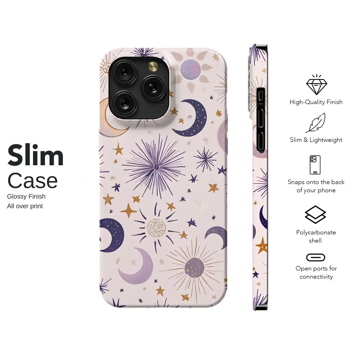 Transport yourself to a whimsical cosmos with this enchanting celestial pattern. The design features a beautifully scattered array of hand-illustrated suns, crescent moons, and twinkling stars. Rendered in a dreamy palette of purple, gold, and deep navy against a soft blush background, this artwork captures a magical, boho-inspired night sky.