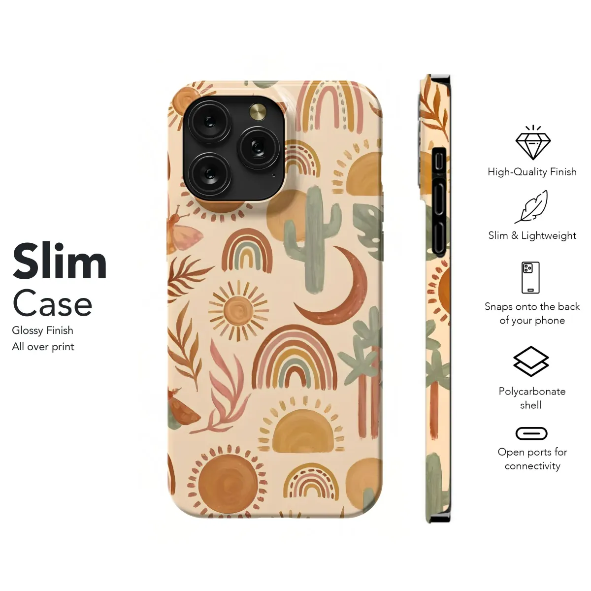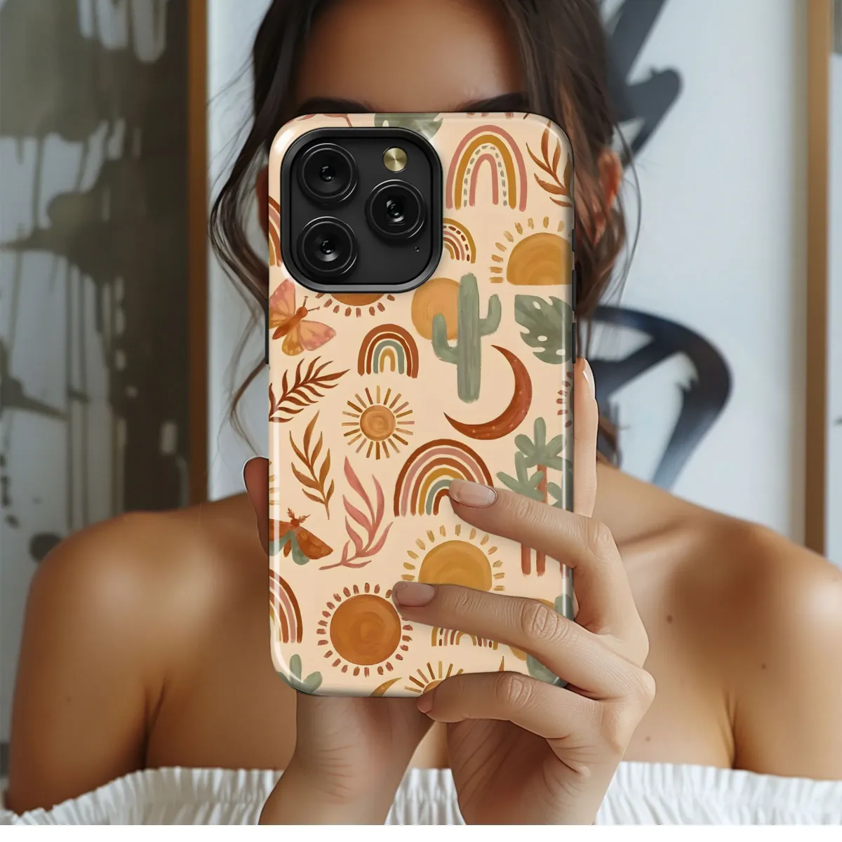 Embrace bohemian vibes with this captivating desert-inspired design, perfect for adding a touch of wanderlust to your everyday essentials. Featuring a delightful array of watercolor-style illustrations including radiant suns, whimsical rainbows, majestic cacti, delicate butterflies, and serene moons, this pattern evokes the free-spirited essence of nature. The warm, earthy tones of terracotta, ochre, and sage green create a harmonious palette that complements any style. This versatile artwork makes a statement, bringing a touch of Southwestern charm to any accessory. Ideal for those who appreciate bohemian, desert, boho, nature, watercolor, pattern, sun, rainbow, cactus, butterfly, and moon aesthetics. Let this enchanting design be a reminder to chase your dreams and embrace the beauty of the world around you. This art design is a unique and stylish way to express your individuality.