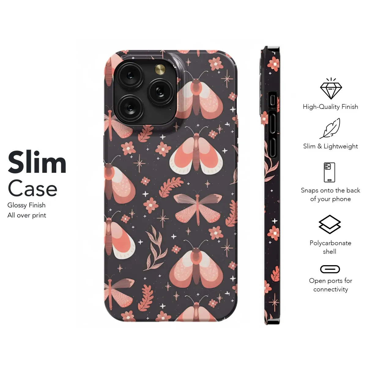 Adorn your tech with this enchanting design featuring delicate moths and dragonflies amidst a sprinkling of stars and botanical accents. The coral hues pop against a deep, dark backdrop, creating a whimsical yet sophisticated aesthetic. Perfect for nature lovers, cottagecore enthusiasts, and anyone drawn to mystical, ethereal themes, this pattern adds a touch of magic to your everyday essentials. Use this design to create a unique and stylish way to express your personality. Let the beauty of these winged creatures and starlit skies transform ordinary objects into extraordinary pieces of art. Consider this design for accessories, device coverings, and more! It's a great gift for friends and family who appreciate unique and eye-catching artwork. Capture the beauty of nature and the allure of the cosmos with this stunning print, ideal for creating personalized gifts and stylish accessories. Let your imagination take flight and create something truly special!