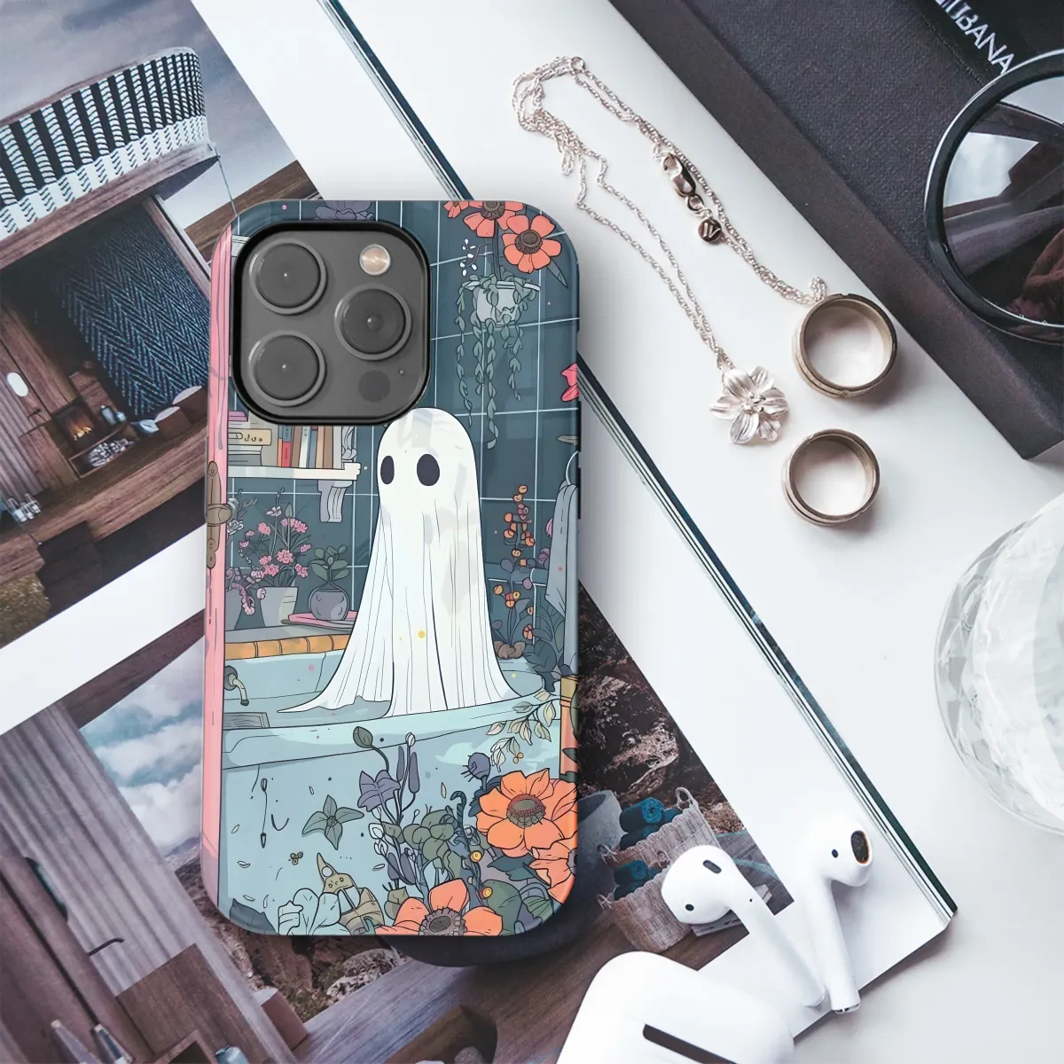 Embrace whimsical charm with this ethereal design, featuring a friendly ghost taking a relaxing bath amidst a flourishing botanical sanctuary. The captivating illustration showcases a whimsical bathroom scene, bursting with vibrant flowers and lush greenery, creating a serene and enchanting atmosphere. This unique artwork is perfect for individuals who appreciate quirky aesthetics and a touch of gothic elegance. The detailed linework and pastel color palette offer a soothing contrast, making it a stylish and captivating accessory. This captivating design is printed using high-quality inks, ensuring vibrant colors and lasting durability. Bring a touch of otherworldly beauty to your everyday life with this enchanting piece, perfect for showcasing your unique personality and love for all things whimsical and magical. Transform your personal style and stand out from the crowd with this eye-catching accessory, an ode to the beautiful and the spectral. This design is a conversation starter and a fantastic gift for friends and family with a love for the unique and the fantastical. Its dreamy aesthetic offers a calming and whimsical touch, making it the perfect blend of spooky and sweet. Add a touch of enchantment to your daily routine with this captivating and unforgettable piece.