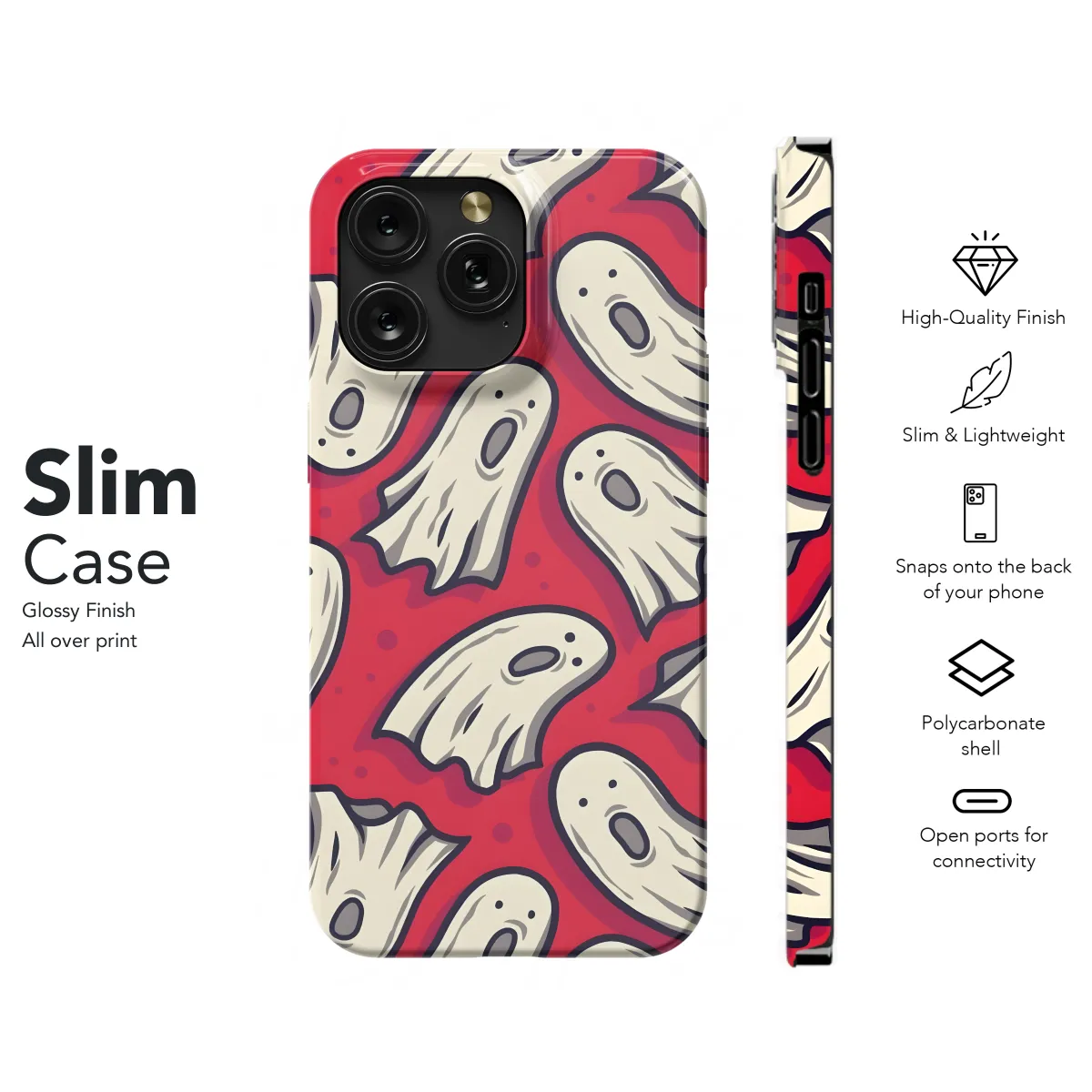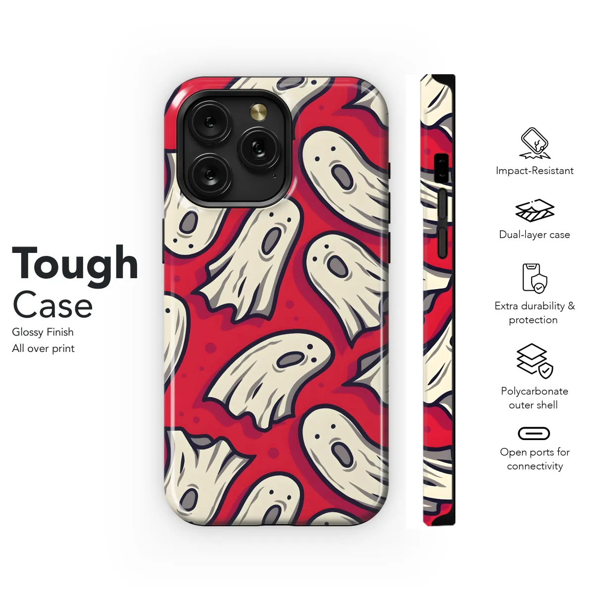 Get into the Halloween spirit with our Boo Spooky Ghosts phone case! This festive case is designed to protect your iPhone, Samsung, or Pixel phone from bumps and scratches, while showing off your love for all things spooky. The case features a playful pattern of ghosts and the word "boo" on a black background. It's the perfect way to add a touch of Halloween fun to your phone.