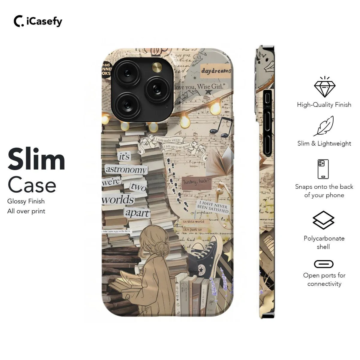 Celebrate the joy of reading and literature with a charming bookish collage phone case. Adorned with images of books, reading glasses, typewriters, and other literary motifs, this accessory captures the essence of book lover culture in a delightful and aesthetic way. Carry a touch of literary inspiration with you wherever you go, letting your device become a tribute to the beauty of storytelling and the magic of books with this delightful and bookish accessory.
