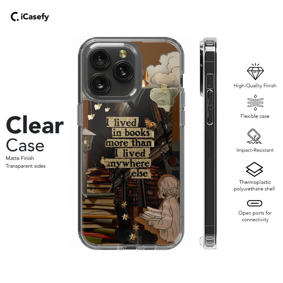 Immerse yourself in the world of literature with our Book Lover Quote Collage phone case. Featuring the poignant phrase "I lived in books more than I lived anywhere else," this design celebrates the sanctuary found within the pages of beloved stories. Adorned with a collage of bookish elements and whimsical illustrations, it captures the essence of literary escape. Crafted for book enthusiasts, it offers both style and protection, with precise cutouts for easy access to ports. Embrace the magic of books with this inspiring accessory.