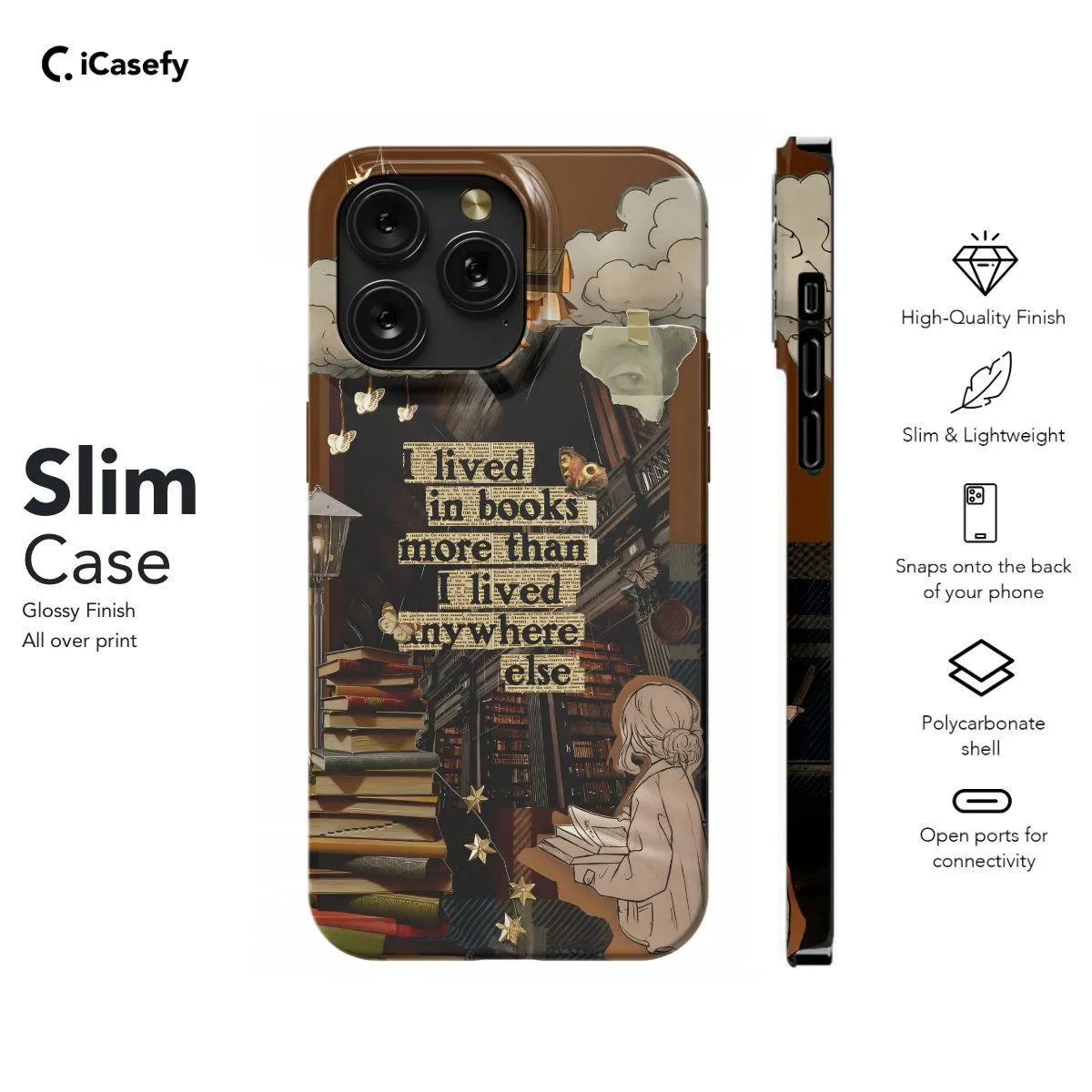 Immerse yourself in the world of literature with our Book Lover Quote Collage phone case. Featuring the poignant phrase "I lived in books more than I lived anywhere else," this design celebrates the sanctuary found within the pages of beloved stories. Adorned with a collage of bookish elements and whimsical illustrations, it captures the essence of literary escape. Crafted for book enthusiasts, it offers both style and protection, with precise cutouts for easy access to ports. Embrace the magic of books with this inspiring accessory.
