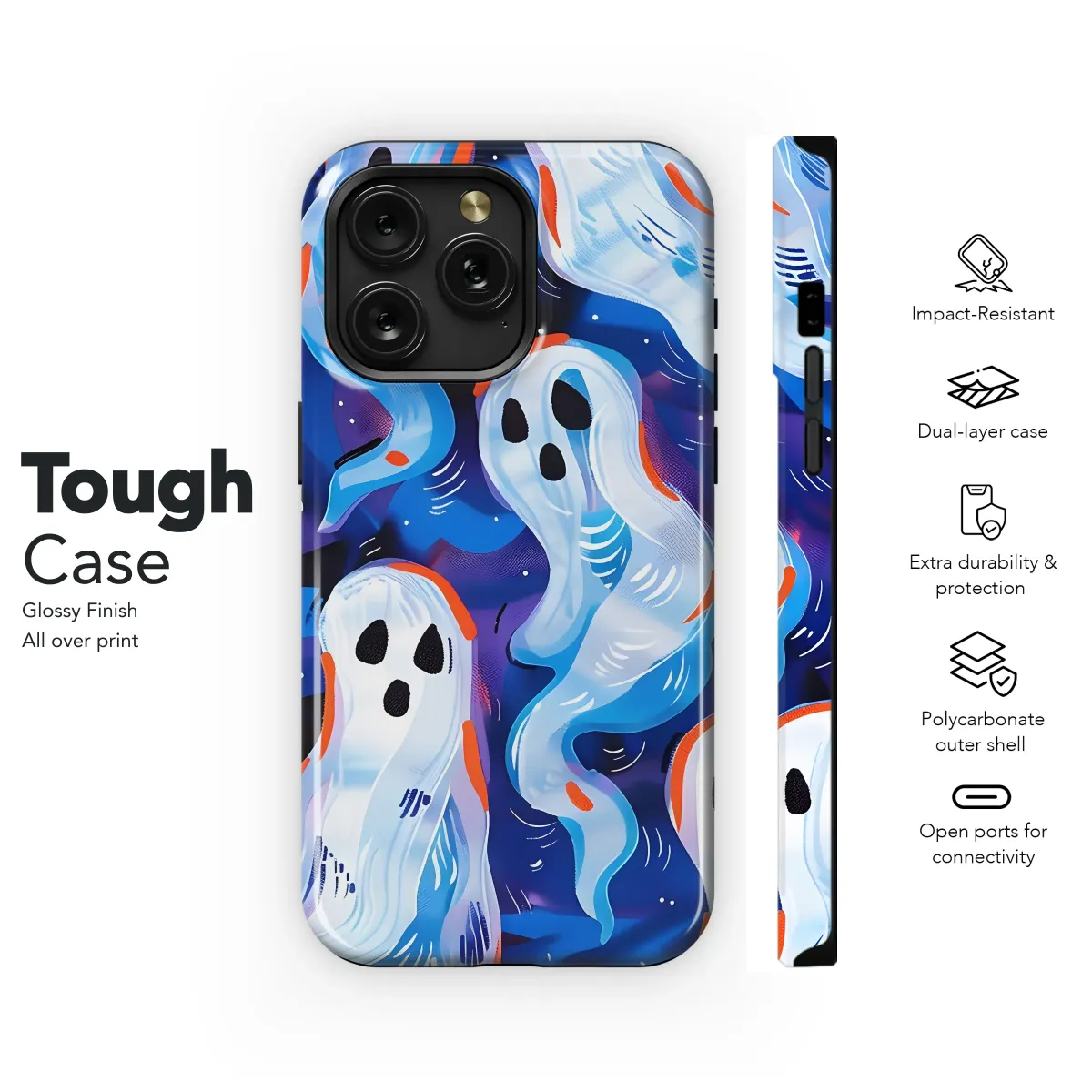 Embrace the spooky season with this vibrant and whimsical design featuring playful ghosts floating through a cosmic, blue galaxy. The abstract swirls of color and unique ghost illustrations create a captivating and stylish aesthetic perfect for adding a touch of eerie charm to your everyday life. This eye-catching print boasts a high-quality, durable finish that's designed to withstand daily wear and tear, ensuring your accessory remains a head-turner for a long time. The bold blue background is complemented by the soft, ghostly white figures, making it a perfect accessory for Halloween celebrations, autumn adventures, or for anyone who appreciates a touch of spooky-chic in their style. Add a unique and spirited touch to your personal style with this enchanting and stylish design. Its vibrant color palette and attention to detail ensure this piece stands out from the crowd, making it a perfect gift for yourself or for a friend who loves a little Halloween magic all year round. This artistic print is sure to become a conversation starter wherever you go, adding a dash of personality to your look. The design is optimized for exceptional print clarity, revealing the intricate details of the ghostly figures and the cosmic background. Get yours today and unleash your inner ghost hunter!