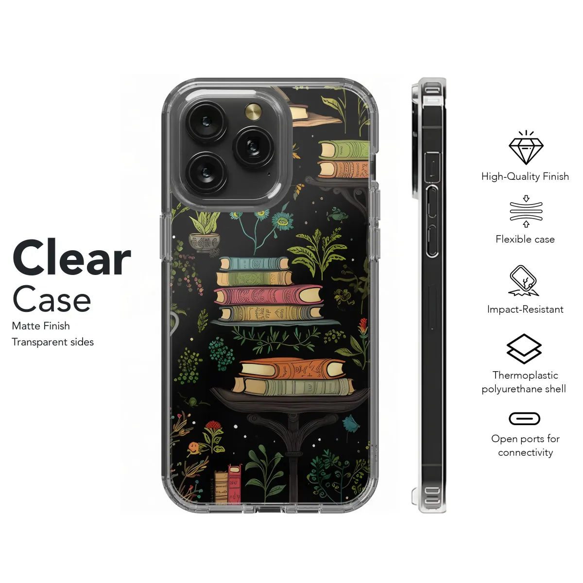 Enchant your everyday tech with this captivating design, perfect for the book lover and plant enthusiast. This artwork features stacks of vintage books nestled amongst lush botanical illustrations, all against a dramatic black backdrop. Imagine carrying a miniature secret garden and personal library wherever you go! The detailed artwork showcases various flora and elegant bookshelves, creating a unique and stylish accessory. Ideal for anyone who appreciates literary aesthetics, library chic, or simply wants to add a touch of whimsical sophistication to their everyday essentials. Elevate your gadget with this artistic expression that speaks volumes about your love for reading and nature. Get yours today and let your inner bookworm bloom! This design is perfect for accessories, covers, and more.