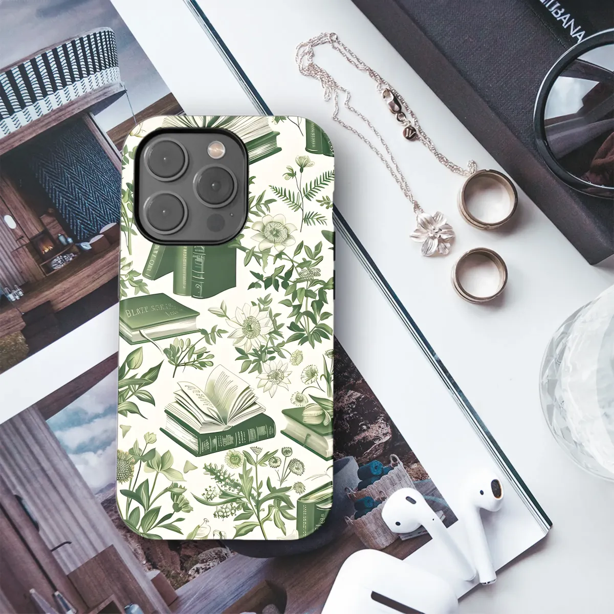Embrace your love for literature and nature with this exquisite design, featuring a captivating array of vintage botanical illustrations intertwined with stacks of antique books. The lush greenery, delicate flowers, and detailed book spines create a sophisticated and romantic aesthetic, perfect for adding a touch of scholarly charm to your personal style. This enchanting pattern showcases a rich palette of deep greens and creamy whites, offering a calming yet elegant feel. The intricate details of the flora and the aged look of the tomes create a sense of old-world sophistication and timeless beauty. A perfect blend of intellectual elegance and natural beauty, this design is a must-have for book lovers and nature enthusiasts alike. Its versatile appeal makes it suitable for a variety of applications, transforming everyday items into unique works of art. The high-quality print ensures vibrant colors and lasting durability, making this a cherished accessory for years to come. Add a touch of vintage charm and literary grace to your accessories with this beautiful, meticulously designed pattern. Express your individuality and passion for the written word and the natural world with this exceptional piece.