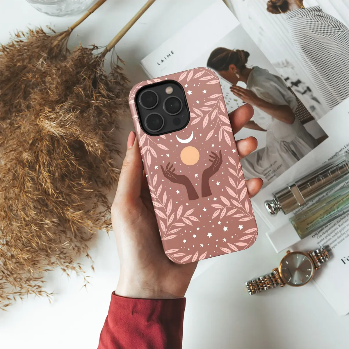 Immerse yourself in the mystical allure of this captivating celestial and botanical art print. This unique design showcases reaching hands gently touching a luminous full moon alongside a delicate crescent moon, all nestled amongst a constellation of sparkling stars and shimmering dots against a rich, earthy background. Elegant botanical branches adorned with graceful leaves flow around the central imagery, grounding the cosmic scene with natural beauty and intricate detail. This artwork is a celebration of the interconnectedness of the universe and nature, embodying spiritual growth, lunar cycles, and personal power. It speaks directly to those who find magic in the night sky, harmony in the natural world, and depth in bohemian, witchy, or dark academia aesthetics. Applying this art to your daily essentials transforms them into portable talismans of unique style and thoughtful design. It offers a distinctive way to personalize your everyday items, adding a layer of aesthetic appeal and a hint of cosmic protection wherever you go. This enchanting pattern is perfect for anyone seeking to express their connection to the stars, the moon, and the earth through their personal accessories. Bring a touch of celestial wonder and botanical grace to your routine with this captivating and meaningful artwork, designed to inspire and beautify your most important daily tools. Crafted for aesthetic appeal and durability when printed on everyday items, this design is a beautiful blend of cosmic energy and earthy charm, making your essential portable items truly stand out.
