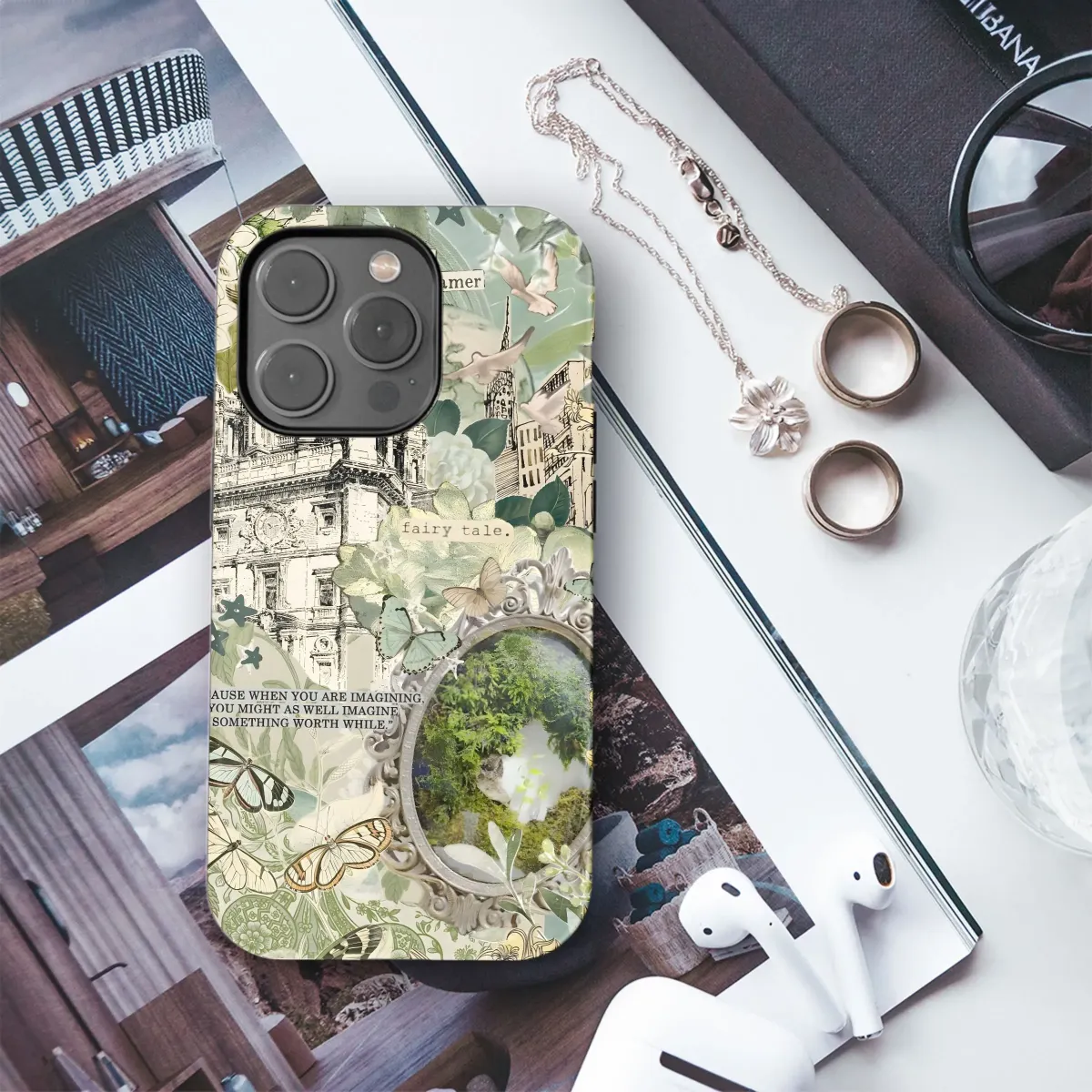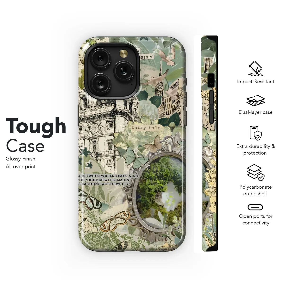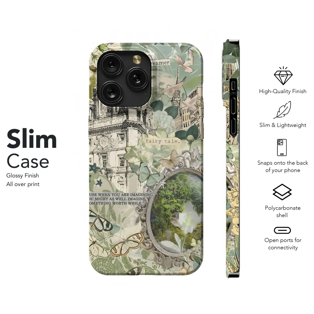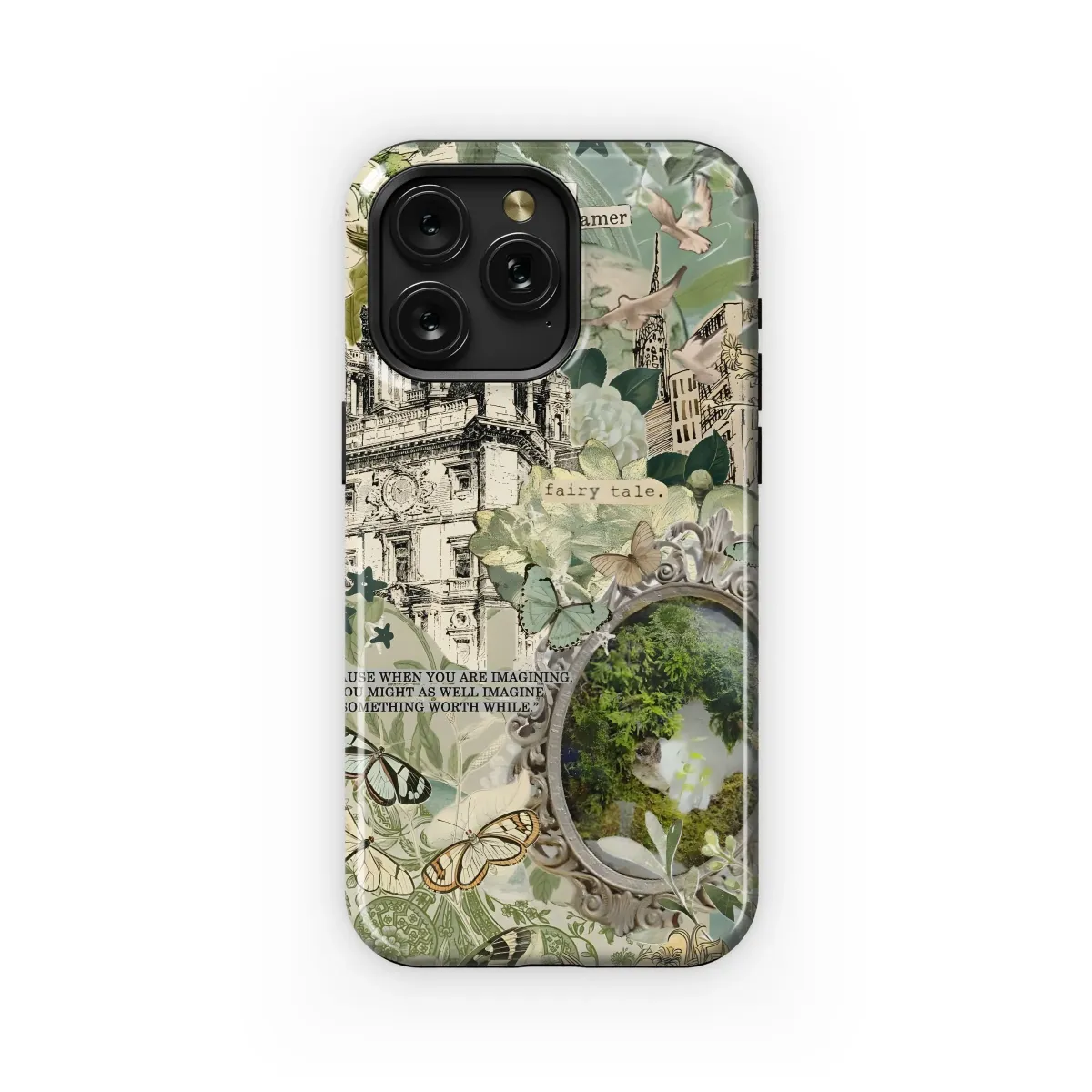 Wrap your device in this enchanting dreamscape. A whimsical collage of botanical illustrations, vintage architectural sketches, and ethereal butterflies come together to create a touch of magic for your everyday carry. The design features a stately building reminiscent of a grand European landmark, nestled amongst lush foliage and delicate floral accents. A vintage-style frame hints at a hidden world, inviting you to “dream on, little dreamer.” Inspirational words remind us, "Because when you are imagining, you might as well imagine something worthwhile." The muted green and beige tones offer a sophisticated, yet playful, aesthetic that will complement any style. Ideal for those who appreciate fairytale aesthetics, vintage-inspired art, garden themes, and motivational quotes. This design is perfect for anyone seeking a touch of whimsy and inspiration in their daily life. A fantastic gift for dreamers, artists, and nature lovers. Unique protection with an artistic flair. Capture the beauty of imagination, fairy tale, dream on, little dreamer, inspirational quotes, vintage design, botanical illustrations, garden, flower, butterflies.
