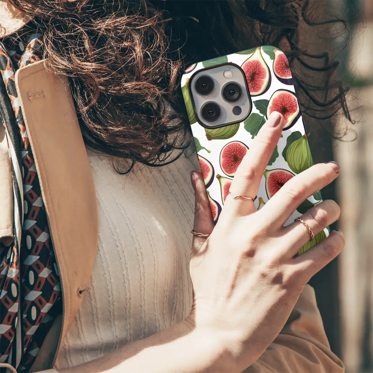 Adorn your accessory with a vibrant botanical illustration of fresh figs. This delightful pattern showcases whole green figs, juicy sliced halves with rich red centers, and lush green leaves scattered across a clean white background, evoking the feel of a summer garden.