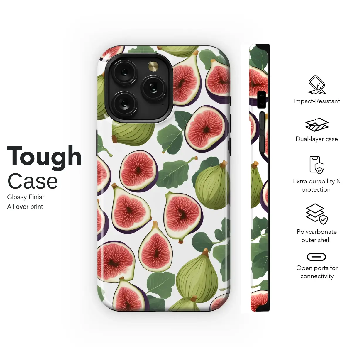 Adorn your accessory with a vibrant botanical illustration of fresh figs. This delightful pattern showcases whole green figs, juicy sliced halves with rich red centers, and lush green leaves scattered across a clean white background, evoking the feel of a summer garden.