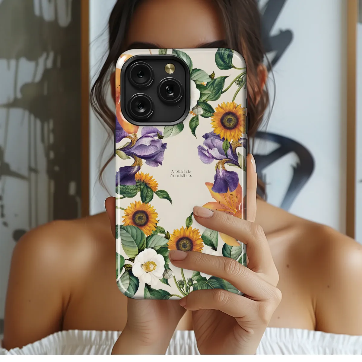 Embrace the beauty of this vibrant floral design, featuring a captivating arrangement of sunflowers, lilies, irises, and camellias. This exquisite botanical artwork is meticulously detailed, showcasing rich colors and textures that evoke a sense of timeless elegance. Perfect for adding a touch of sophisticated charm to your personal style, this design transforms your everyday accessory into a statement piece. The intricate details of each bloom are beautifully rendered, creating a visually stunning pattern that's both classic and contemporary. The calming color palette blends seamlessly with various aesthetics, making it an ideal choice for those who appreciate artistry and refined design. This design is printed with high-quality inks for vibrant, long-lasting color and exceptional detail. Elevate your look with this unique and eye-catching design, a testament to nature's artistic splendor. "A felicidade é um hábito" (Happiness is a habit) is subtly incorporated, adding a touch of inspirational charm. Transform your accessory into a wearable work of art.