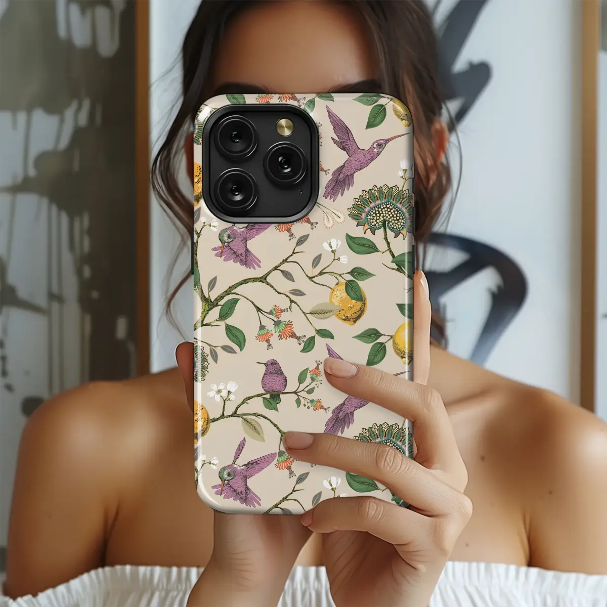 Adorn your device with this enchanting botanical pattern featuring elegant purple hummingbirds amidst lemon tree branches. This vintage-inspired illustration captures a whimsical garden scene, with detailed citrus fruits, ornate blossoms, and lush green leaves creating a vibrant and artistic nature-inspired look.
