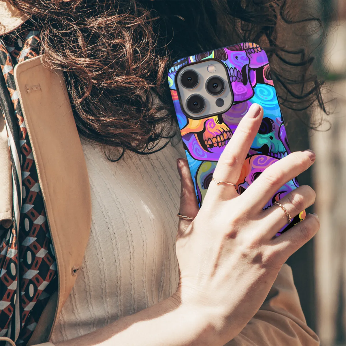 Protect your phone with a touch of vibrant individuality! Showcasing an eye-catching seamless pattern of painted skulls in a rainbow of colors, this phone case delivers both style and security.