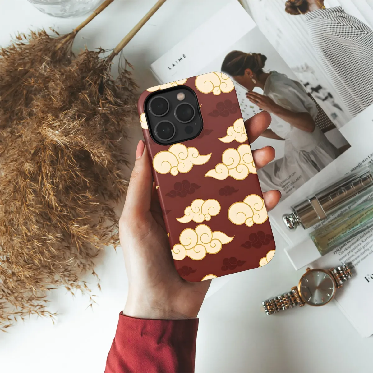 Elevate your everyday carry with this captivating Asian-inspired cloud pattern, perfect for adding a touch of Eastern mystique to your device. This design features stylized, swirling clouds in creamy ivory and gold, gracefully floating against a rich, deep burgundy background, interspersed with darker, subtle cloud accents for added depth. The intricate details and vibrant colors evoke a sense of serenity and good fortune, reminiscent of traditional Chinese and Japanese art. Ideal for anyone who appreciates elegant aesthetics, cultural motifs, or simply wants to add a unique and stylish flair to their mobile companion. This eye-catching design is sure to spark conversations and showcase your refined taste. Get this unique wrap that seamlessly blends ancient symbolism with modern style, making it the perfect statement piece. Great for lovers of Japanese art, Chinese designs, sky motifs, cloud patterns, and elegant burgundy aesthetic.