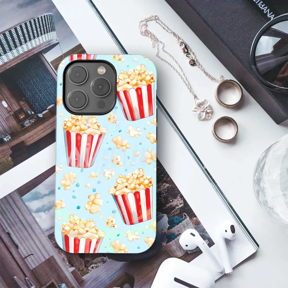 Ready for showtime? Capture the magic of the movies and the joy of your favorite snack with this delightfully nostalgic design, perfect for adding a pop of personality to your daily essentials. Each buttery, golden kernel and classic red-and-white striped bucket is rendered with a beautiful watercolor effect, giving it a soft, hand-painted feel that stands out against the dreamy sky-blue backdrop. It’s a playful, whimsical pattern that evokes the cozy excitement of a cinema date, the fun of the fairground, or a happy movie night at home. Let this charming artwork wrap your most essential tech in a stylish, protective embrace, transforming it into a conversation piece that showcases your fun-loving spirit. This durable and artistic shield is the ultimate movie lover gift, a perfect foodie accessory for a friend, or a sweet treat for yourself. It’s a little piece of happiness for anyone who adores a cute aesthetic, retro cinema vibes, and a pattern that is bursting with character and nostalgic charm.