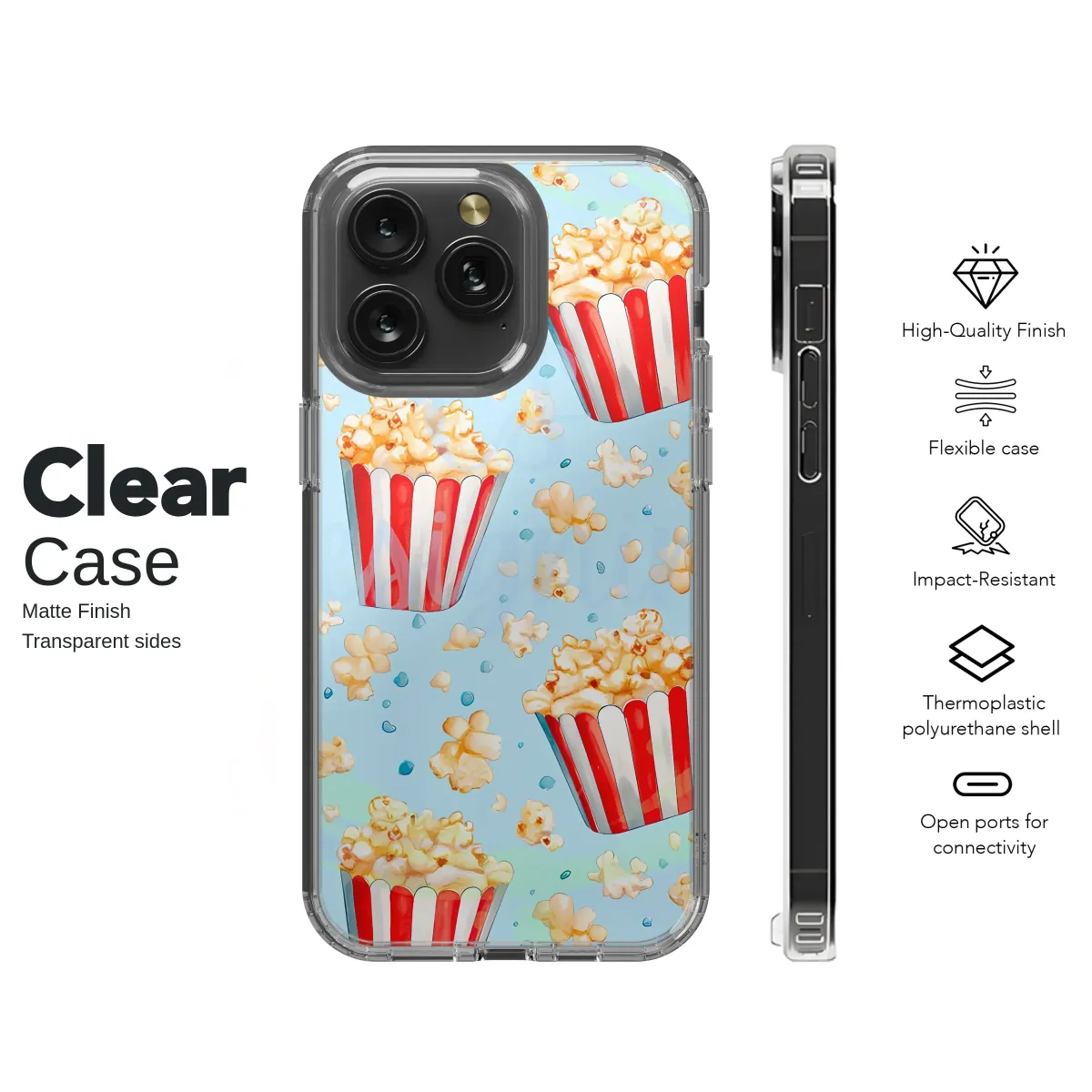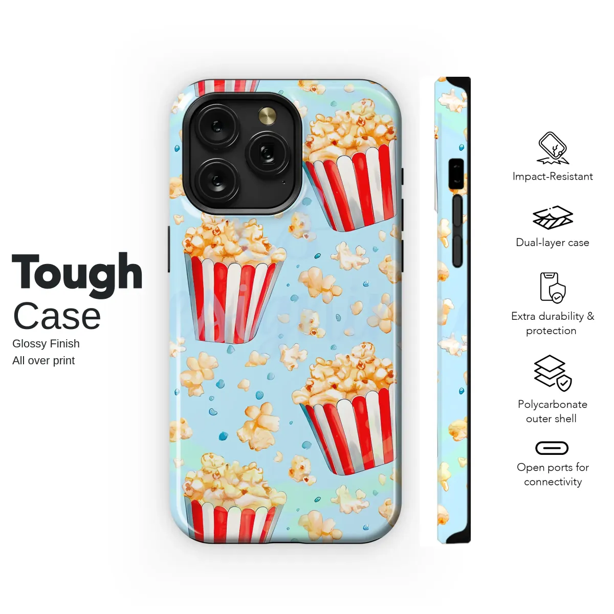 Ready for showtime? Capture the magic of the movies and the joy of your favorite snack with this delightfully nostalgic design, perfect for adding a pop of personality to your daily essentials. Each buttery, golden kernel and classic red-and-white striped bucket is rendered with a beautiful watercolor effect, giving it a soft, hand-painted feel that stands out against the dreamy sky-blue backdrop. It’s a playful, whimsical pattern that evokes the cozy excitement of a cinema date, the fun of the fairground, or a happy movie night at home. Let this charming artwork wrap your most essential tech in a stylish, protective embrace, transforming it into a conversation piece that showcases your fun-loving spirit. This durable and artistic shield is the ultimate movie lover gift, a perfect foodie accessory for a friend, or a sweet treat for yourself. It’s a little piece of happiness for anyone who adores a cute aesthetic, retro cinema vibes, and a pattern that is bursting with character and nostalgic charm.