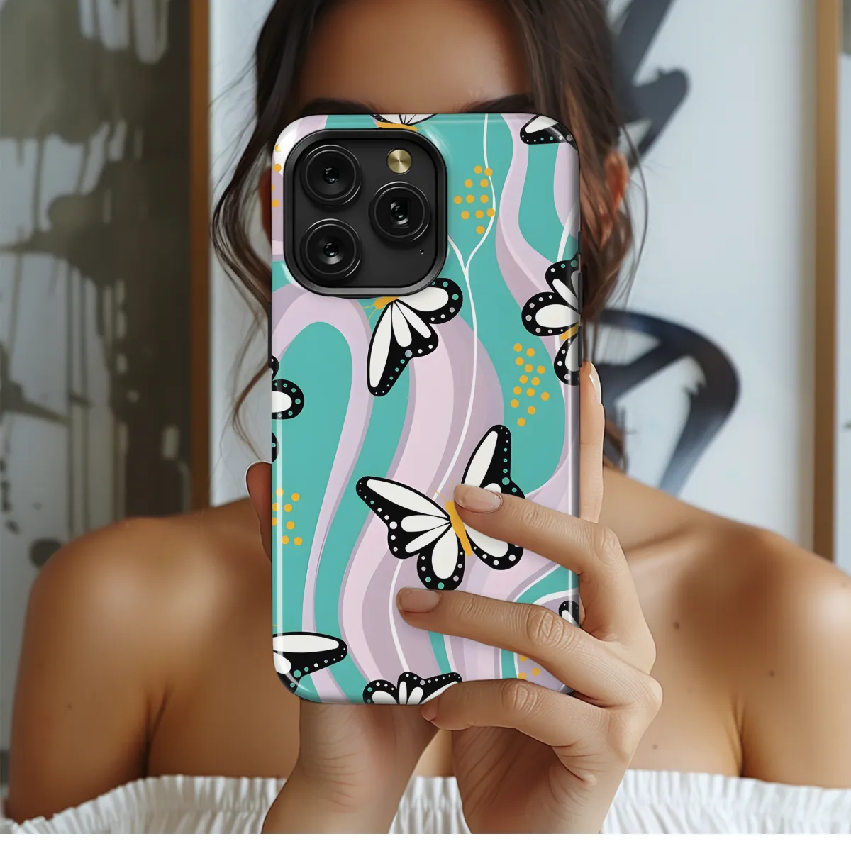 This exquisite Butterfly Wavy Phone Case offers a mesmerizing fusion of beauty and protection for your precious iPhone, Samsung, or Pixel device. Its captivating design boasts a vibrant array of butterflies adorning a gentle, ripple-like pattern, creating a truly enchanting visual masterpiece. Each case is meticulously crafted to ensure a perfect fit, safeguarding your phone from scratches and impacts without compromising its sleek silhouette or functionality. Experience the perfect balance of elegance and durability with our Butterfly Wavy Phone Case.